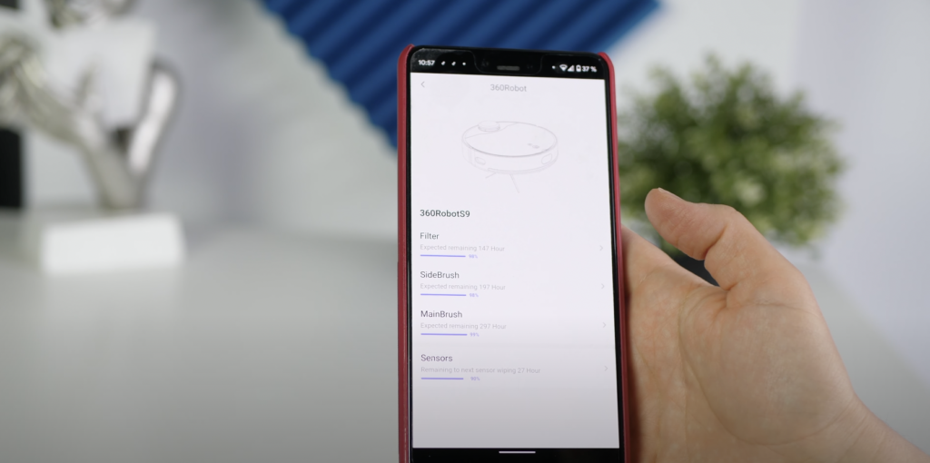 În ceea ce privește mentenanța, robotul de aspirare cere un minim de atenție. Tot ce trebuie să faci este să golești periodic recipientul de colectare. Dacă uiți, nu-i bai, te anunță el când ar fi cazul să o faci. Filtrul HEPA este lavabil, asta înseamnă că îl poți spăla sub jet de apă. Îl scuturi cât poți de bine de praf înainte de a-l spăla, îl pui la uscat, după care îl poți refolosi. Peria principală trebuie și ea curățată, nu doar de praf ci și de păr, iar aici poți folosi accesoriul de tăiat, care se regășește pe recipientul de colectare. Senzorii trebuie șterși și ei din când în când. Se mai așează praf pe ei, iar asta face ca roboțelul să nu mai funcționeze în parametri optimi. Cât despre mop. recomandarea mea este să fie montat atunci când este folosit. În cazul în care lași cârpa atașată robotului de aspirare după ce și-a terminat treaba, riști să capete acel miros de îmbâcseală.