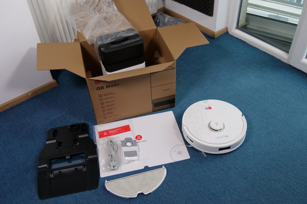 Roborock Q8 Max+ vine într-o cutie generoasă, de fapt în 2 cutii, este bine ambalat, astfel încât să ajungă în siguranță. La interior te întâmpină un quick start guide de dimensiuni generoase, unde îți explică clar ce pași să urmezi pentru a instala robotul și a te conecta la aplicație. Procesul fiind foarte intuitiv și ușor de parcurs. Tot în cutie mai găsim și baza, docului de încărcare, stația de golire automată, aspiratorul, mopul cu lavetă preinstalată și un sac pentru praf de rezervă.