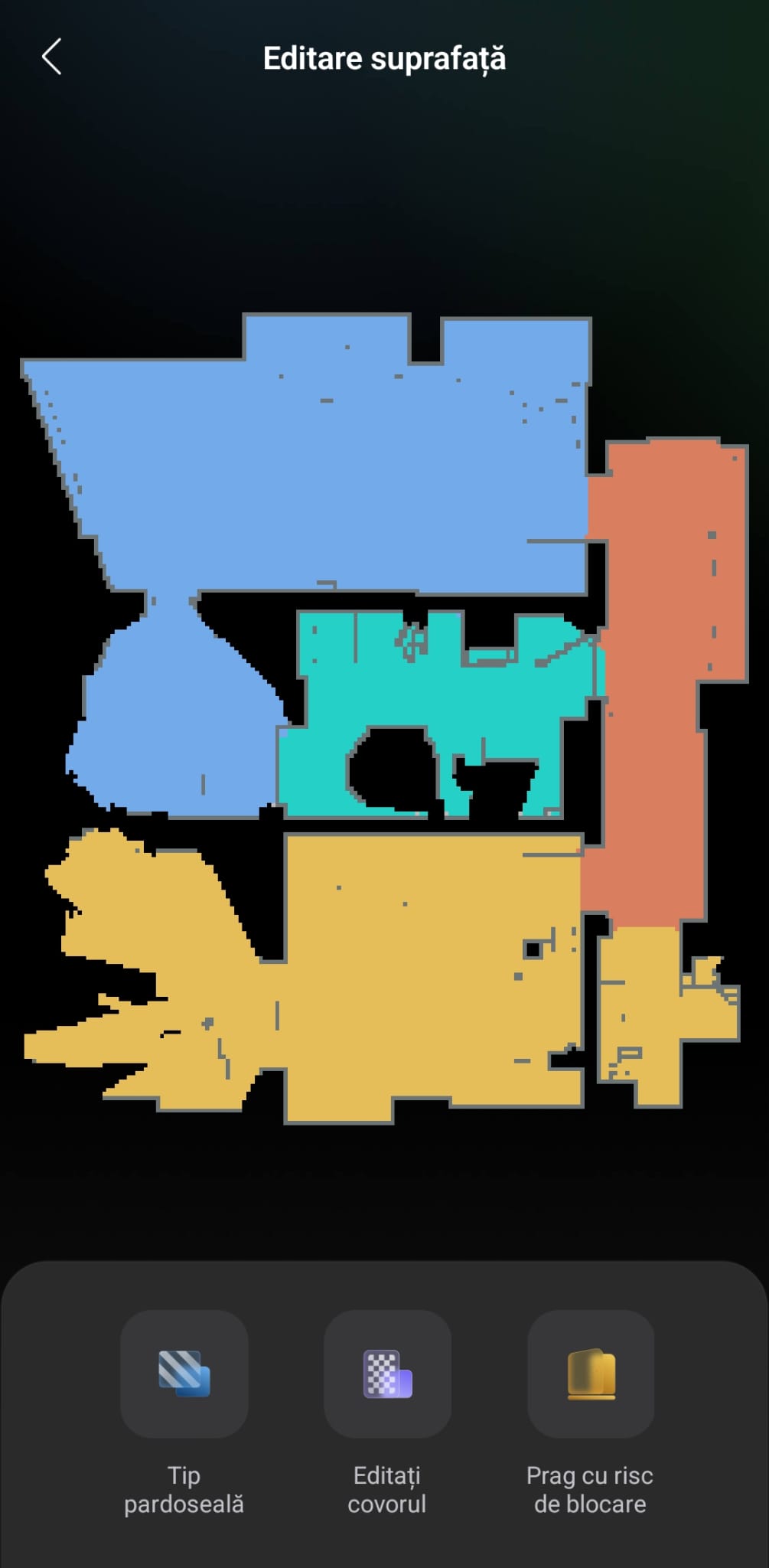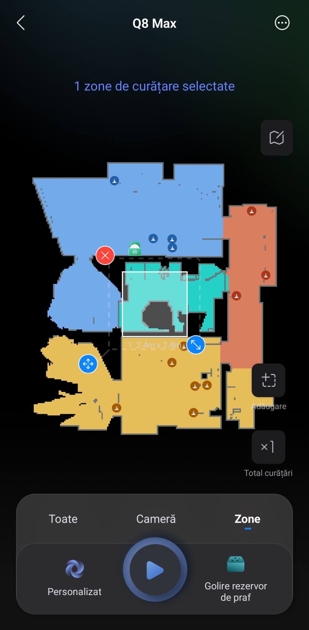 - Zone personalizate de curățare – Dacă vrei ca robotul să curețe doar o anumită parte a casei, poți delimita acea zonă pe hartă. De exemplu, dacă ai vărsat ceva în bucătărie, selectezi doar acea zonă pentru o curățare rapidă.