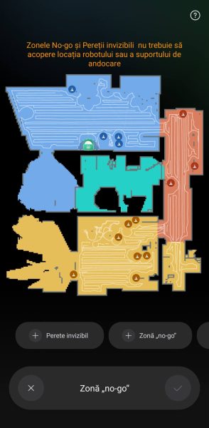 - Zone No-Go – Poți crea zone în care robotul nu trebuie să intre. Acestea sunt utile pentru locuri sensibile, cum ar fi spații cu cabluri încurcate sau colțuri dificile.