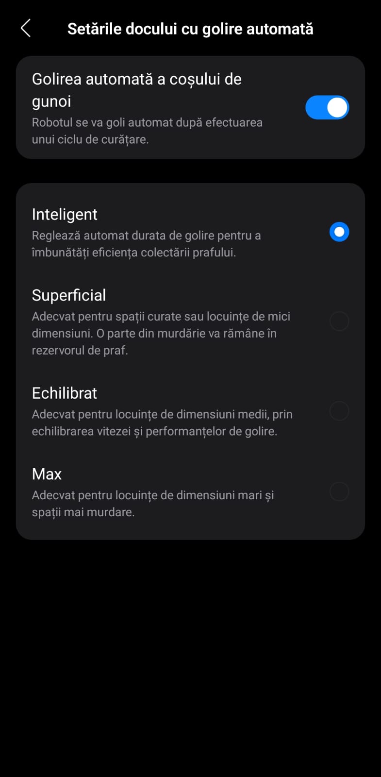 Stația de golire automată este o adevărată salvare pentru uituci ca mine. Sacul de praf poate stoca murdăria pentru până la 7 săptămâni, iar periile robotului se curăță automat în timpul acestui proces.