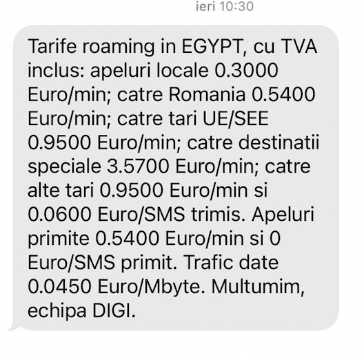 Fix asta am pățit eu cu Orange zilele trecute, când am ajuns în Egipt. Nici n-am apucat să mă cazez bine că primesc un apel. Un reprezentant Orange mă informa că am de plată 57 euro pentru serviciile de Roaming. Neatentă, am uitat să îmi opresc datele mobile înainte să aterizeze avionul. Abia după o oră m-am “trezit” să fac asta. Ei bine tariful de 57 euro apăruse doar pentru notificările care apucaseră să apară pe telefon. Ca idee tarifele de roaming la Orange pentru Egipt arată cam așa: