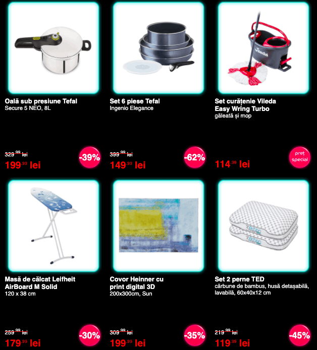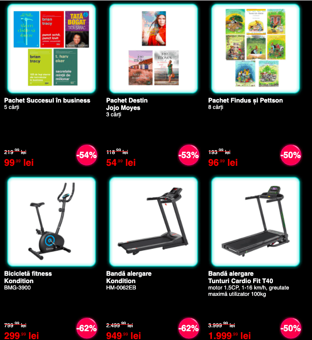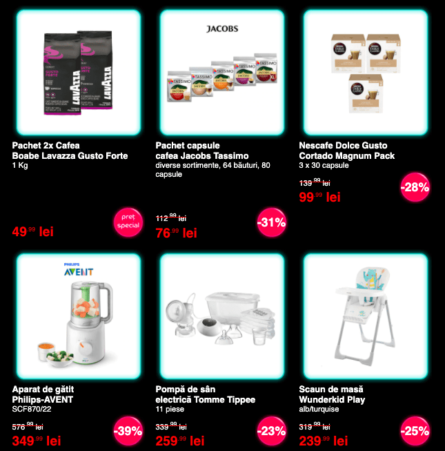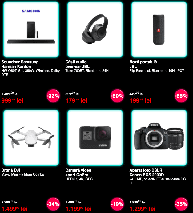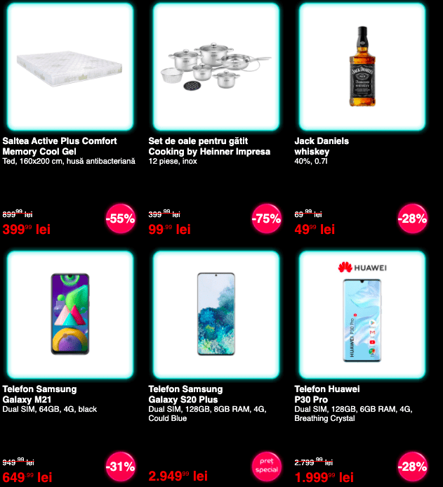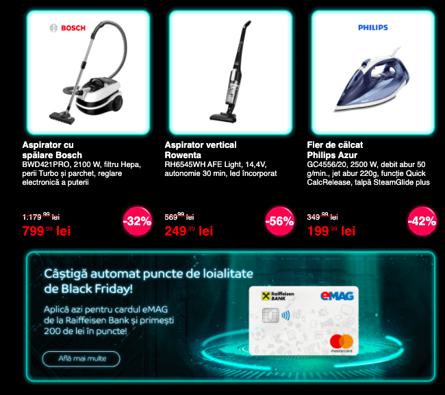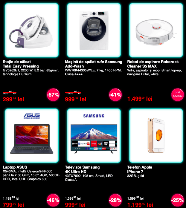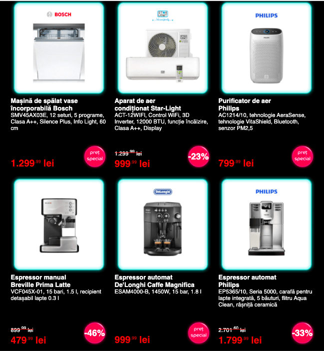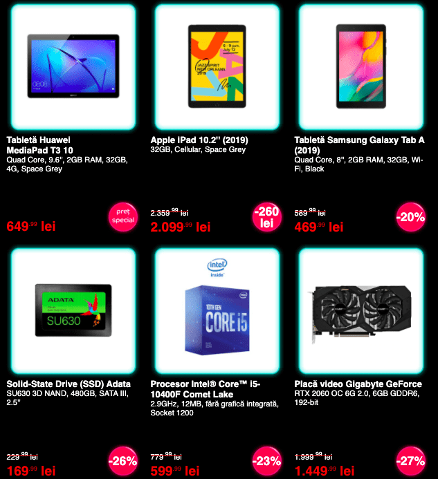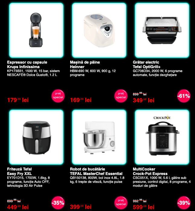 Iată ce produse vei găsi de dimineață pe eMAG, la reducere. Mai jos ai catalogul de promoții complet. Te sfătuiesc să fii pe fază, cele mai bune oferte se vor epuiza în primele secunde. În ultimii ani, eMAG a dat startul în jurul orei 7:00 dimineața. Iată cam cum arată oferta pe care eMAG a pregătit-o pentru ediția aniversară de 10 ani Black Friday 2020!