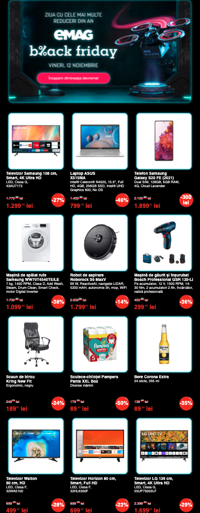 Iată ce oferte a pregătit eMAG pentru Black Friday 2021. Mai jos poți vedea catalogul eMAG cu oferta completă: