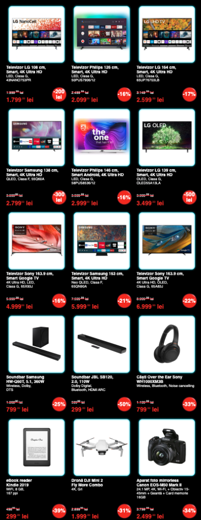 – Samsung 43AU7172 – 1299 lei(1779 lei). Televizorul este Smart, 4K și are o diagonală de 108 cm.