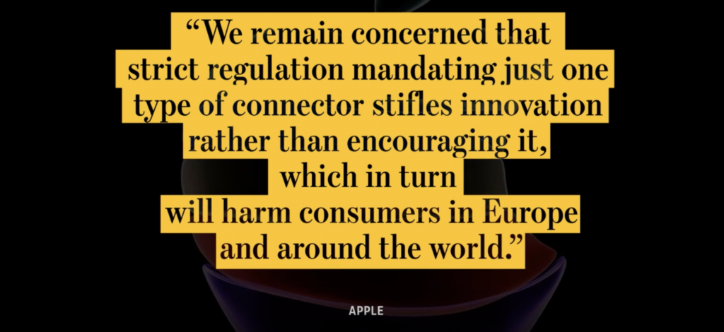 Apple consideră că obligativitatea de a trece la un port universal mai degrabă ar îngrădi inovația, decât s-o încurajeze, iar acest aspect va afecta consumatorul pe termen lung.