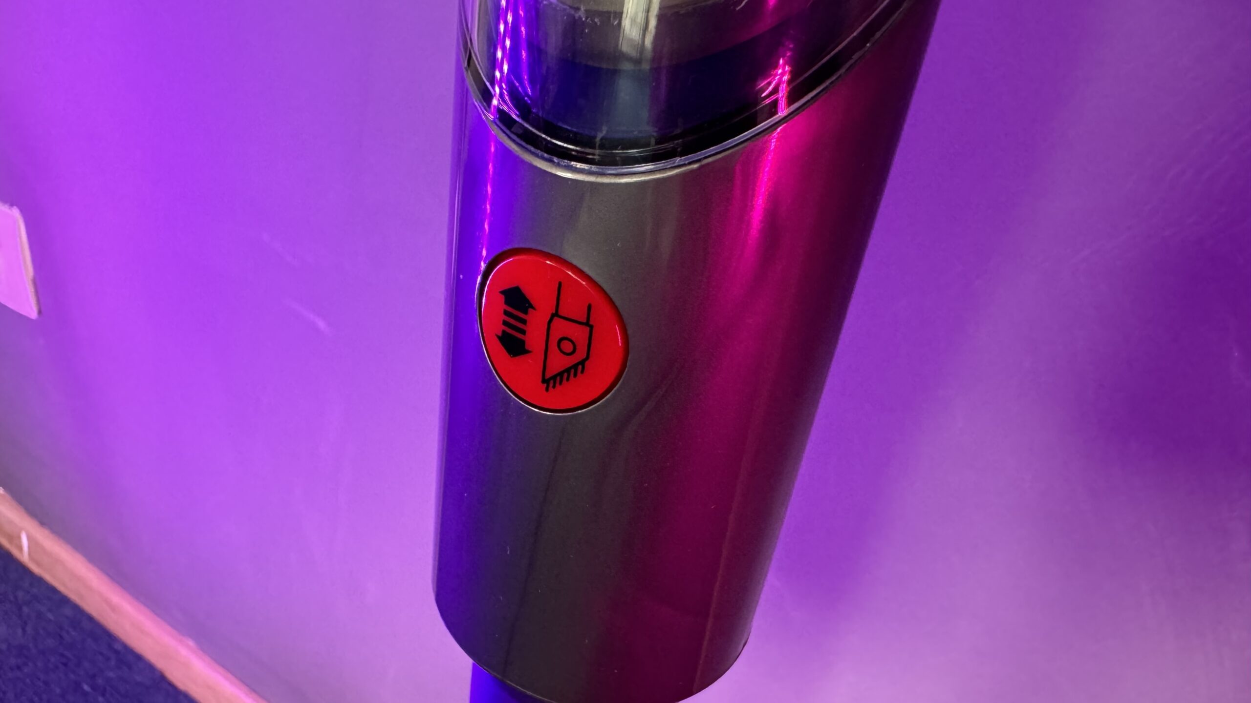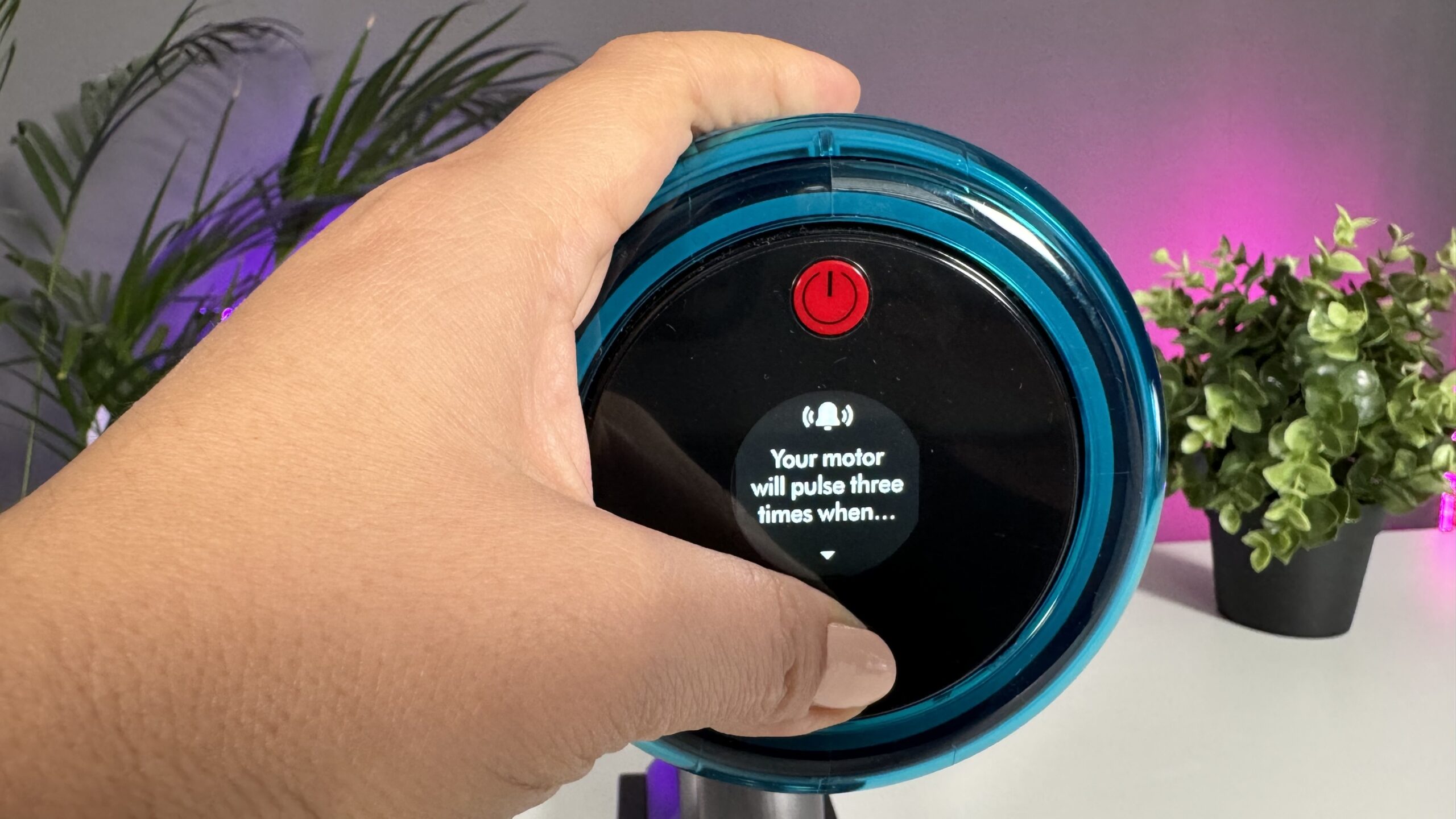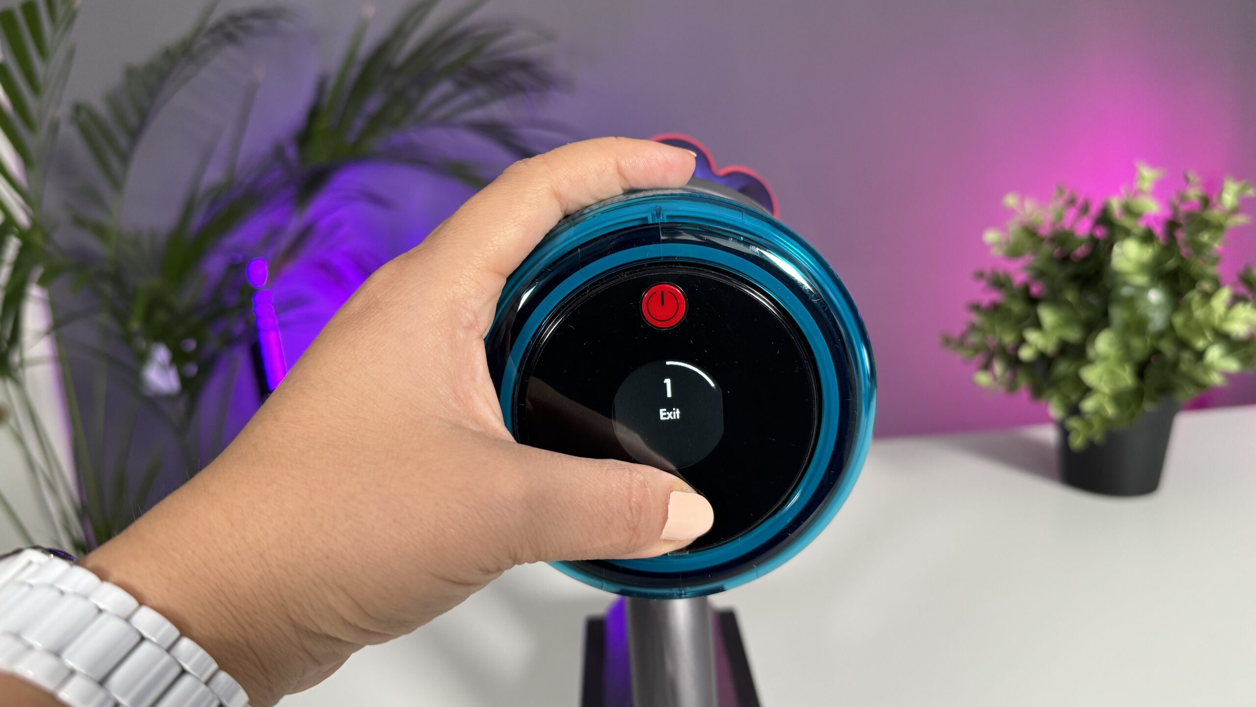 Îmi place că de data aceasta butonul de pornire/oprire nu mai trebuie apăsat în permanență atunci când folosești aspiratorul. Acum avem deasupra display-ului LCD un buton Power roșu, o idee mult mai bună față de ce modelul anterior, unde trebuia să ții apăsat în permanență butonul Power când aspirai.