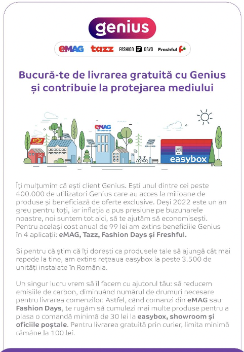 eMAG modifică termenii pentru serviciul Genius. Dacă până acum puteai comanda la easybox, showroom sau oficiile poștale, orice îți doreai, indiferent de sumă, iată că regulile s-au schimbat. Mai nou atât pentru comenzile de pe eMAG, cât și pentru cele de pe Fashion Days, Tazz sau Freshfull, retailerul nu va mai oferi transportul gratuit. Prin această decizie, eMAG își propune să pună umărul la protejarea mediului înconjurător, prin reducerea emisiilor de carbon. Se pare că mulți abonați Genius abuzau de acest serviciu, plasând chiar și comenzi cu o valoare foarte mică.