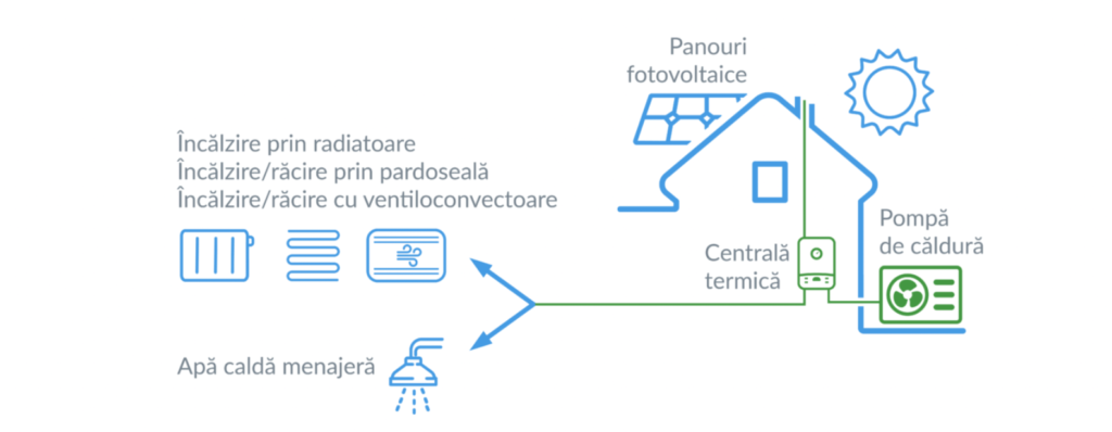 Pompa de căldură aer-apă extrage căldura și umezeala din mediul exterior și o folosește pentru a încălzi interiorul locuinței și pentru a produce apă caldă menajeră. O pompă de căldură este mai eficientă în lunile calde, iar centrala termică pe gaz este mai eficientă în lunile reci. În lunile de iarnă, când temperaturile scad destul de mult, când scade temperatura sub -10 grade Celsius, se face comutarea și intră centrala termică în funcțiune. În felul acesta se menține o eficiență mai bună, cu costuri reduse.