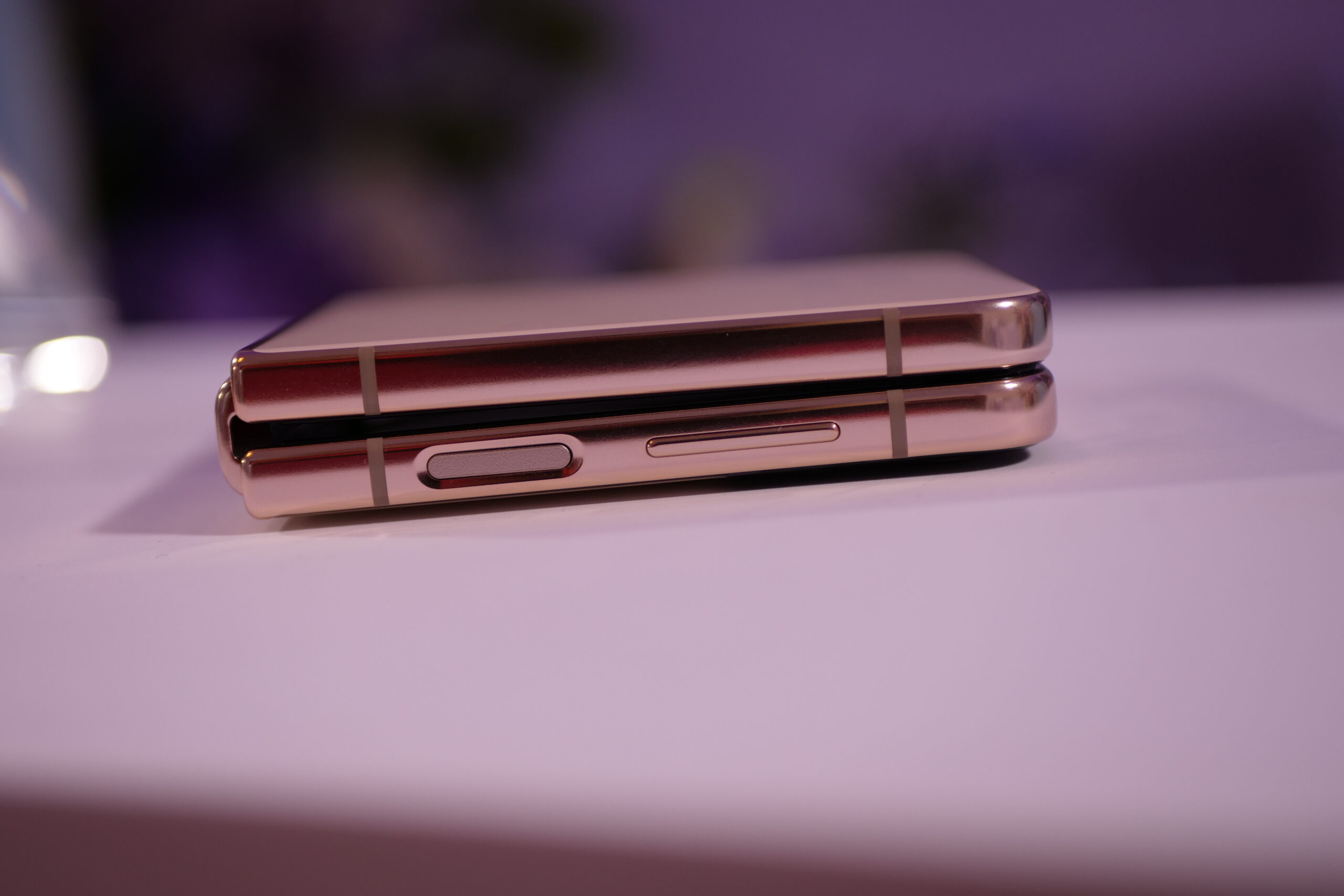 Și-ncepem cu mezinul acestei serii, Galaxy Z Flip 4, modelul pliabil preferat de partea feminină datorită dimensiunilor reduse ale acestuia atunci când este pliat, dar și datorită gamei de culori atât de caldă și de versatilă. Anul acesta telefonul vine în 4 nuanțe: Bora Purple, Graphite, Pink Gold și Blue. Preferatele mele au fost ultimele două nuanțe, dar și acel crem aș spune că sugerează eleganță și rafinament. Cântărește 187 g. Este puțin mai înalt și o idee mai îngust, față de generația anterioară. Mi se pare că se așează mai bine în mână. Amplasarea butoanelor rămâne aceeași ca anul trecut.