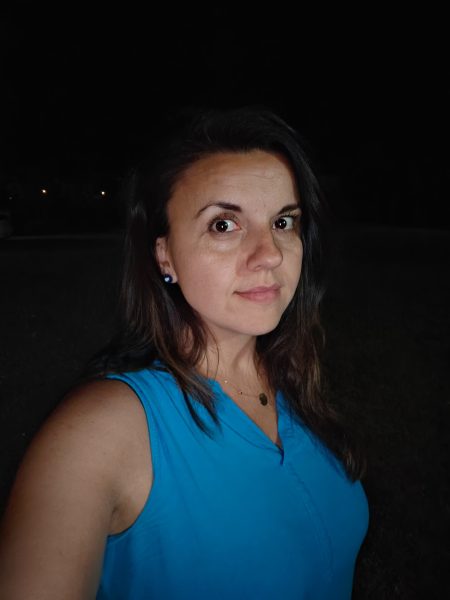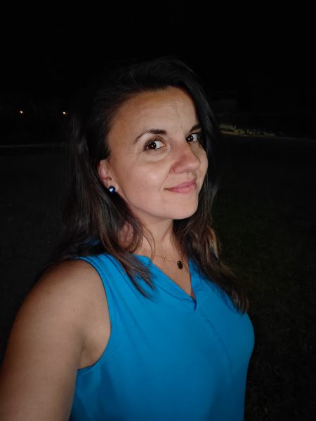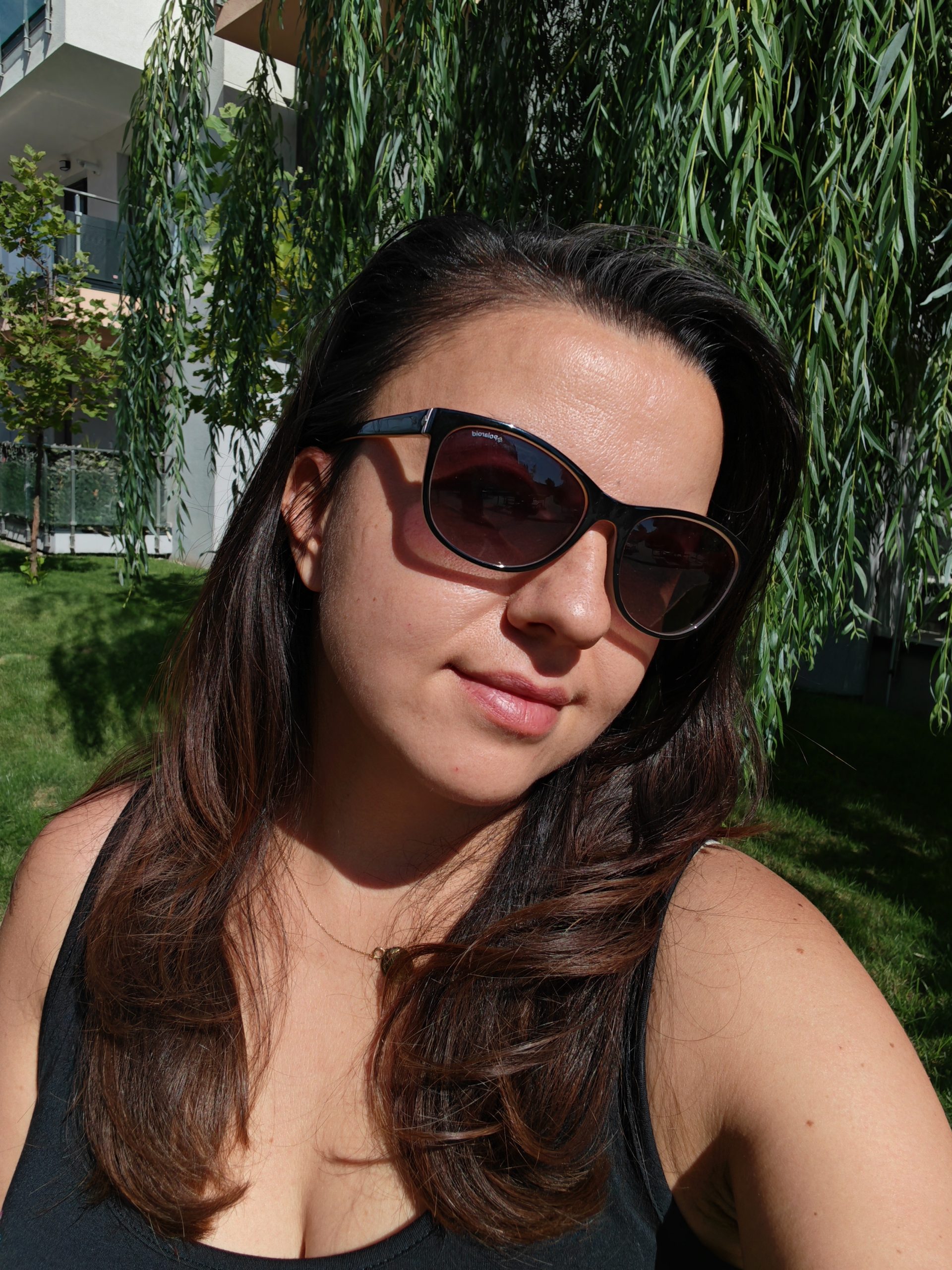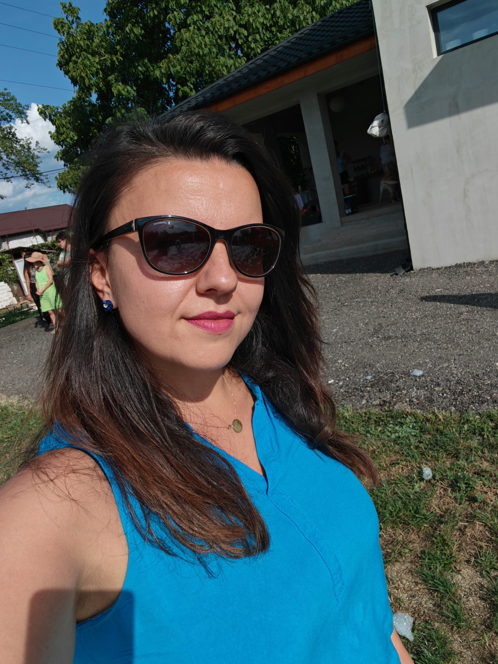Și trecem și la camera de selfie, o cameră duală, un element mai rar în zilele noastre. Aici avem un senzor principal wide, de 50 MP, cu f/2.1 și un senzor secundar pentru efectul de bokeh de 2 MP cu f/2.4.Filmează 4K la 30 fps. Selfie-urile sunt bune, după cum poți vedea aici. Chiar și în condiții slabe de luminozitate am rămas plăcut surprinsă de rezultate. Aici era chiar întuneric, undeva pe la orele 22:00 și iată câte detalii. E adevărat, nu ies toate selfie-urile atât de clare, dar cu puțină răbdare, poți obține rezultate surprinzător de bune.