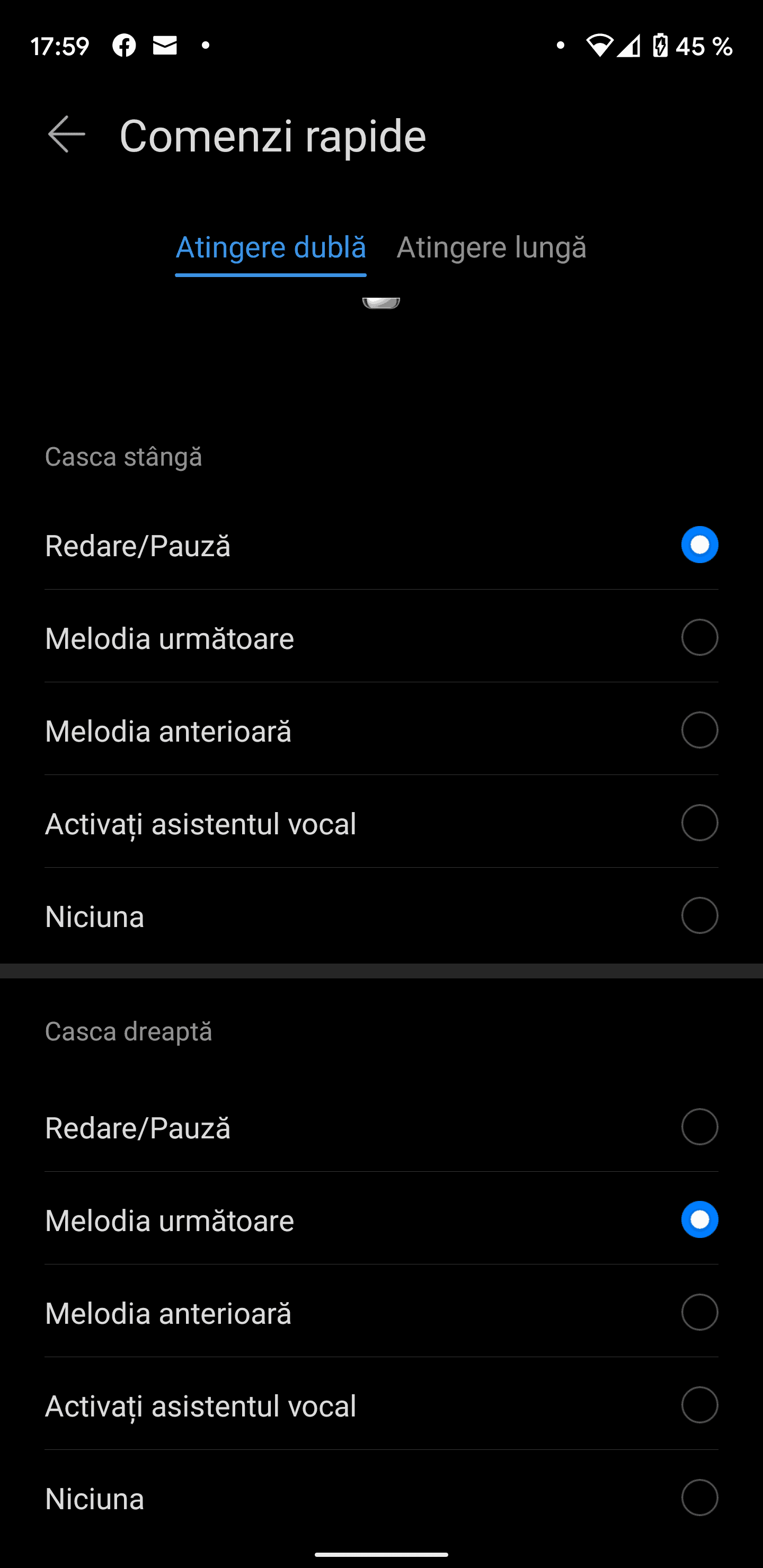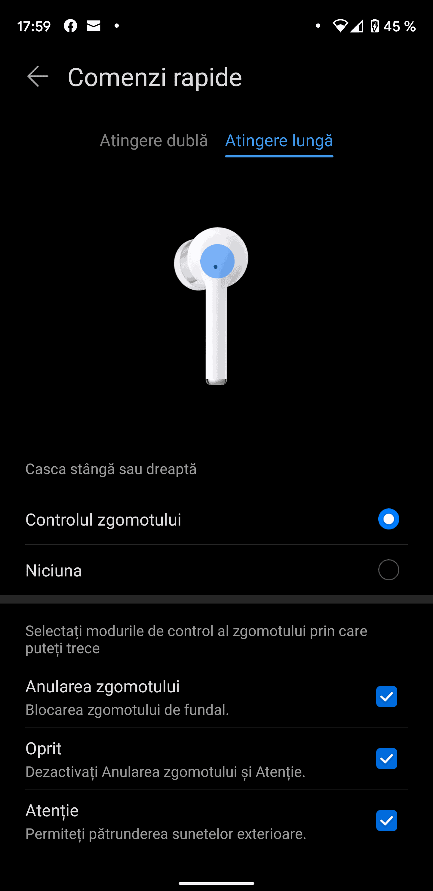 Comenzile rapide pot fi și ele personalizate după dorințele utilizatorului. Dubla atingere a căștii, oferă posibilitatea de a opta pentru acțiuni diferite per cască. Poți alege de la redare/pauză, răspuns/respins, controlul melodiilor și activarea asistentului virtual. Eu am setat casca stângă pentru Redare/Pauză, iar casca dreaptă pentru răspuns/respins. A durat ceva pana m-am obișnuit să nu mai confund care cască e pentru una, care e pentru alta. Tot aici, la partea de comenzi rapide, ai posibilitatea de a controla funcția de noise cancellation printr-o apăsare lungă. Mi-a plăcut faptul că FreeBuds 4i au un control tactil bun, chiar foarte bun și asta datorită senzorului capacitiv de atingere. Ca și la generația anterioare, volumul nu-l vei putea controla din căști, ci doar din telefon, respectiv tabletă. Aplicația oferă și funcția Smart Wear Detection, care se folosește de un senzor infraroșu pentru detectarea momentului în care utilizatorul folosește căștile. La ce folosește funcția? De exemplu atunci când asculți muzică și scoți căștile din urechi, muzica se întrerupe, repornind iarăși în momentul în care ele sunt așezate din nou în ureche.