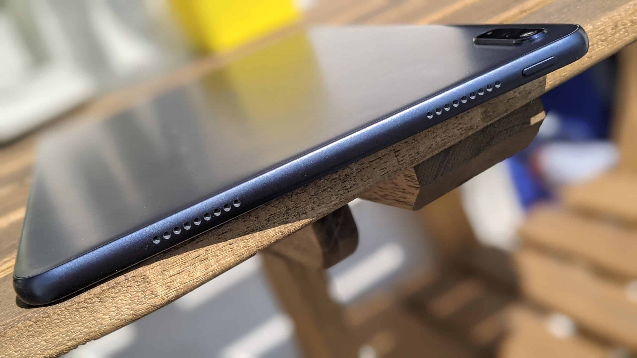 Are o diagonală de 10,4 inch, marginile ecranului nu sunt nici groase, dar nici foarte subțiri. Camera secundară este poziționată în partea superioară pe centru. Pe latura superioară avem butoanele pentru volum și 4 microfoane, acest detaliu l-am întâlnit și pe HUAWEI MatePad Pro anul trecut. Pe latura inferioară avem sertarul pentru SIM, latura stângă găzduiește butonul de pornire/oprire + două difuzoare, iar pe latura dreaptă găsim alte două difuzoare și portul USB-C.