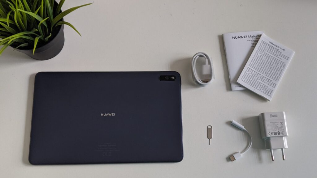 Tableta, vine într-o cutie albă, finuță, în interiorul căreia mai găsim alte 2 cutii: una include un Super Charger de 10W, iar cealaltă, cheița pentru SIM, un cablu de încărcare, USB-A la USB-C, un adaptor pentru jack-ul de 3,5 mm și garanția + manualul de utilizare.
