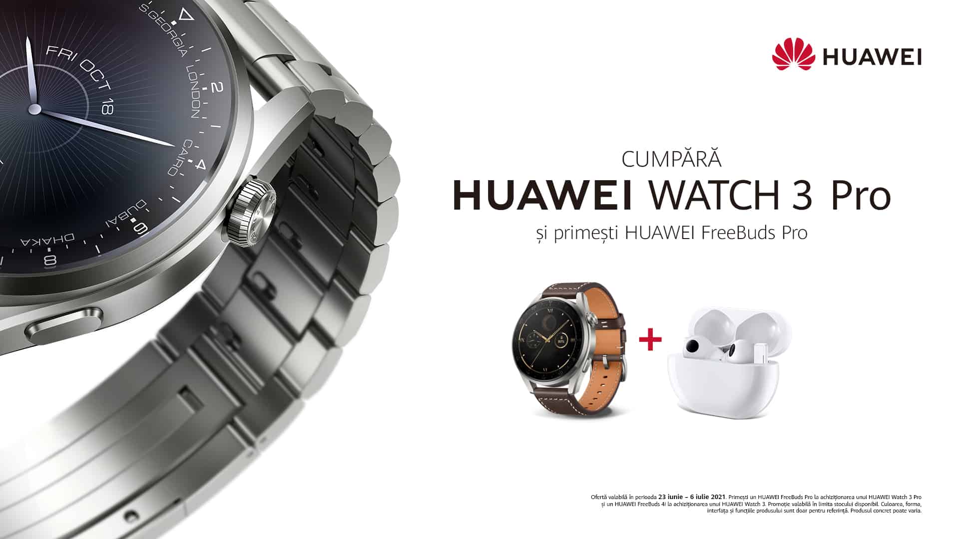 – Huawei Watch 3 Pro – 1999 lei varianta din piele + CADOU o pereche de căști FreeBuds Pro