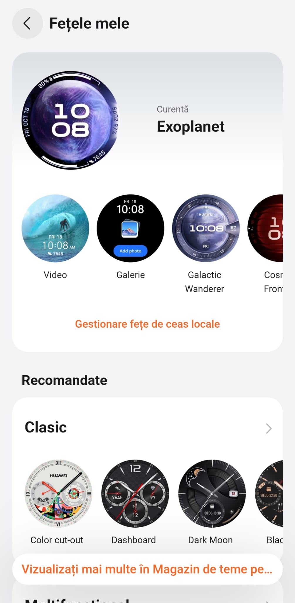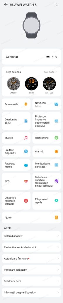 Tot din aplicație poți schimba watchface-urile, seta alerte, gesturi, configura eSIM-ul sau descărca aplicații din magazinul Huawei. Practic, îți personalizezi complet ceasul în funcție de stilul tău de viață.
