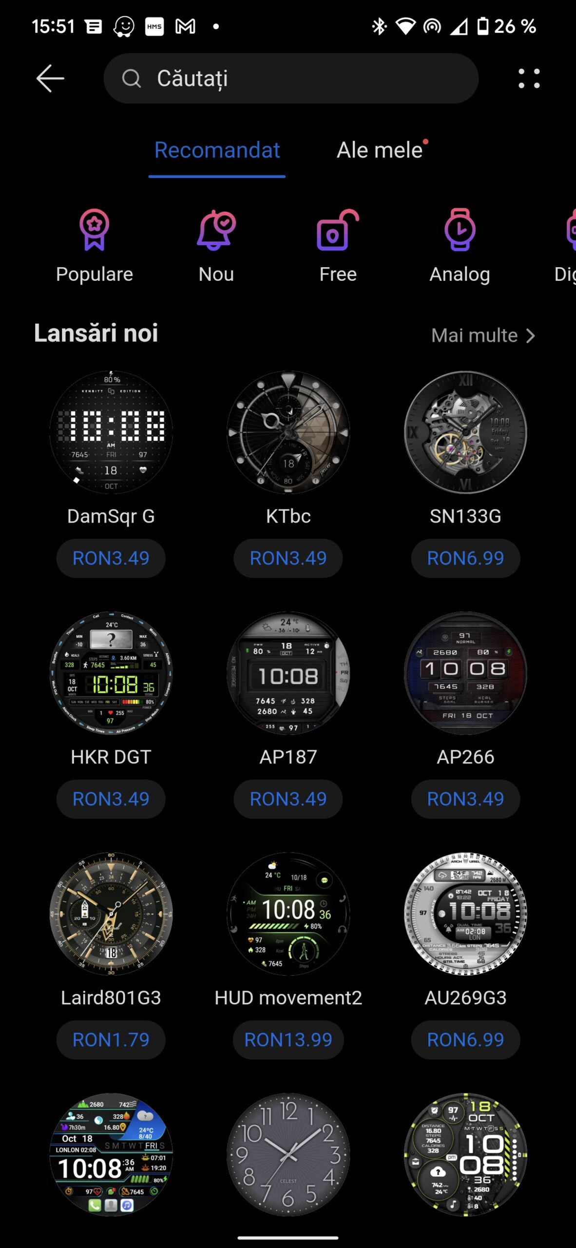 Fețele ceasului le poți schimba printr-o apăsare lungă, după care swipe în dreapta pentru a alege ceea ce îți dorești. Mie cel mai mult mi-a plăcut aceasta. Evidențiază și mai bine frumusețea ceasului, iar seara, se schimbă în mod automat în modul noapte. Pe lângă acestea ai o gamă extrem de variată de fețe astfel încât să nu te plictisești câtuși de puțin de acest accesoriu.
