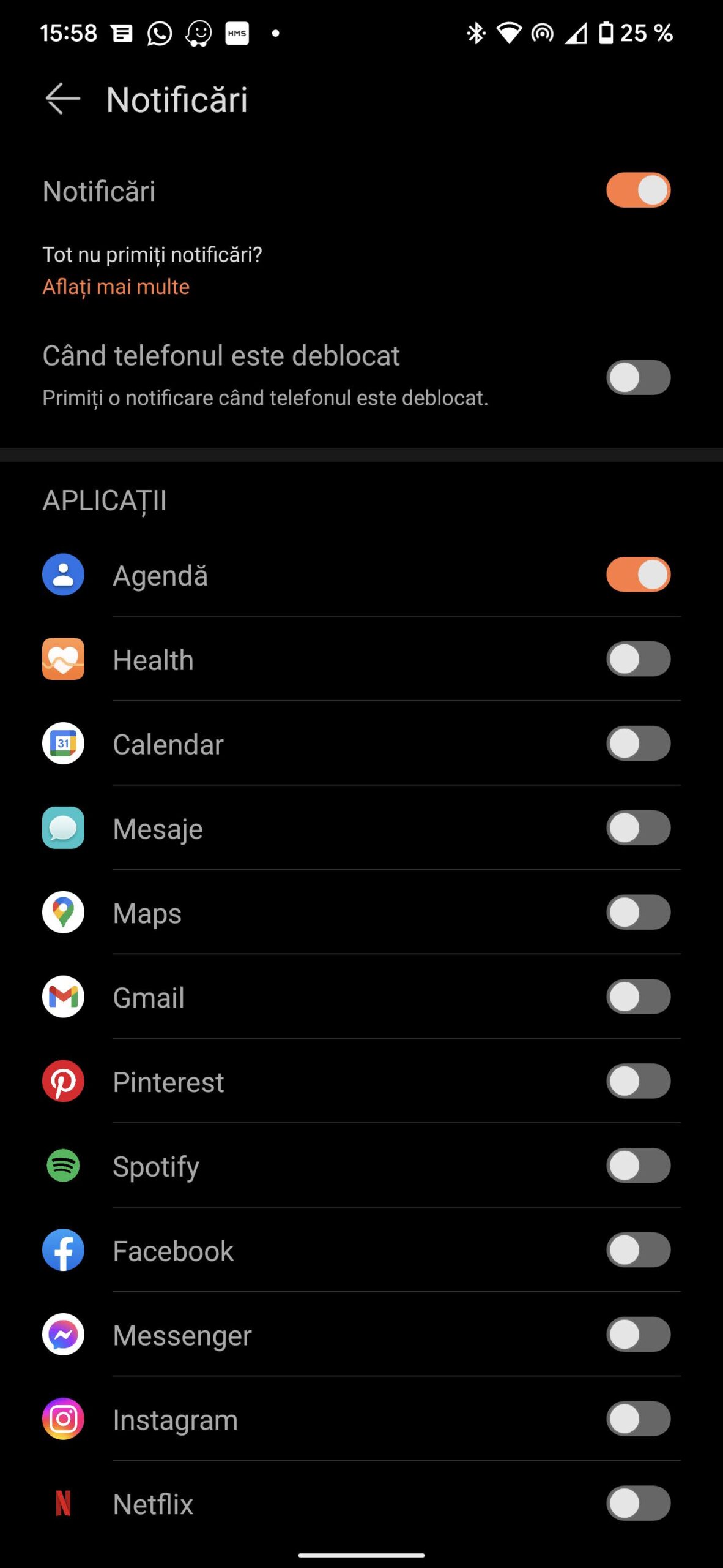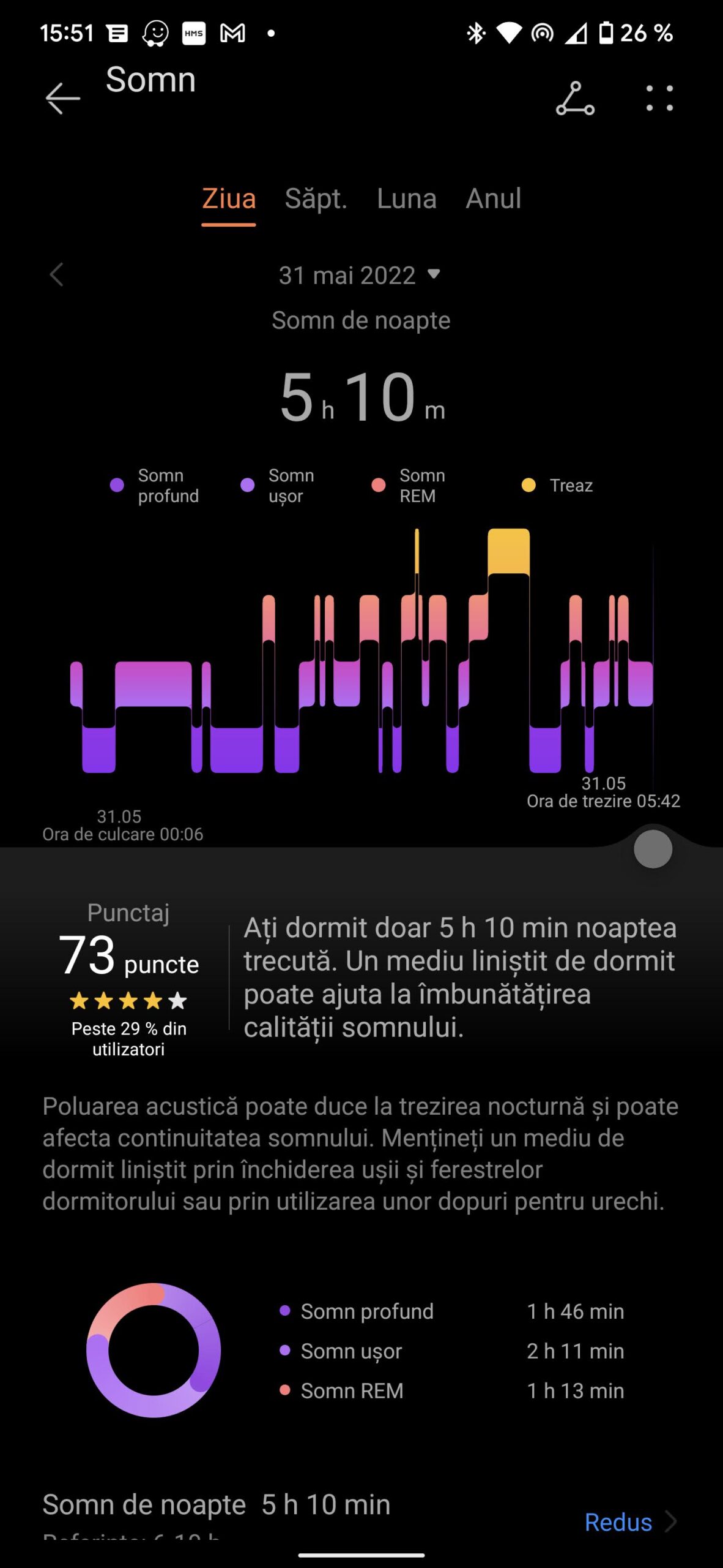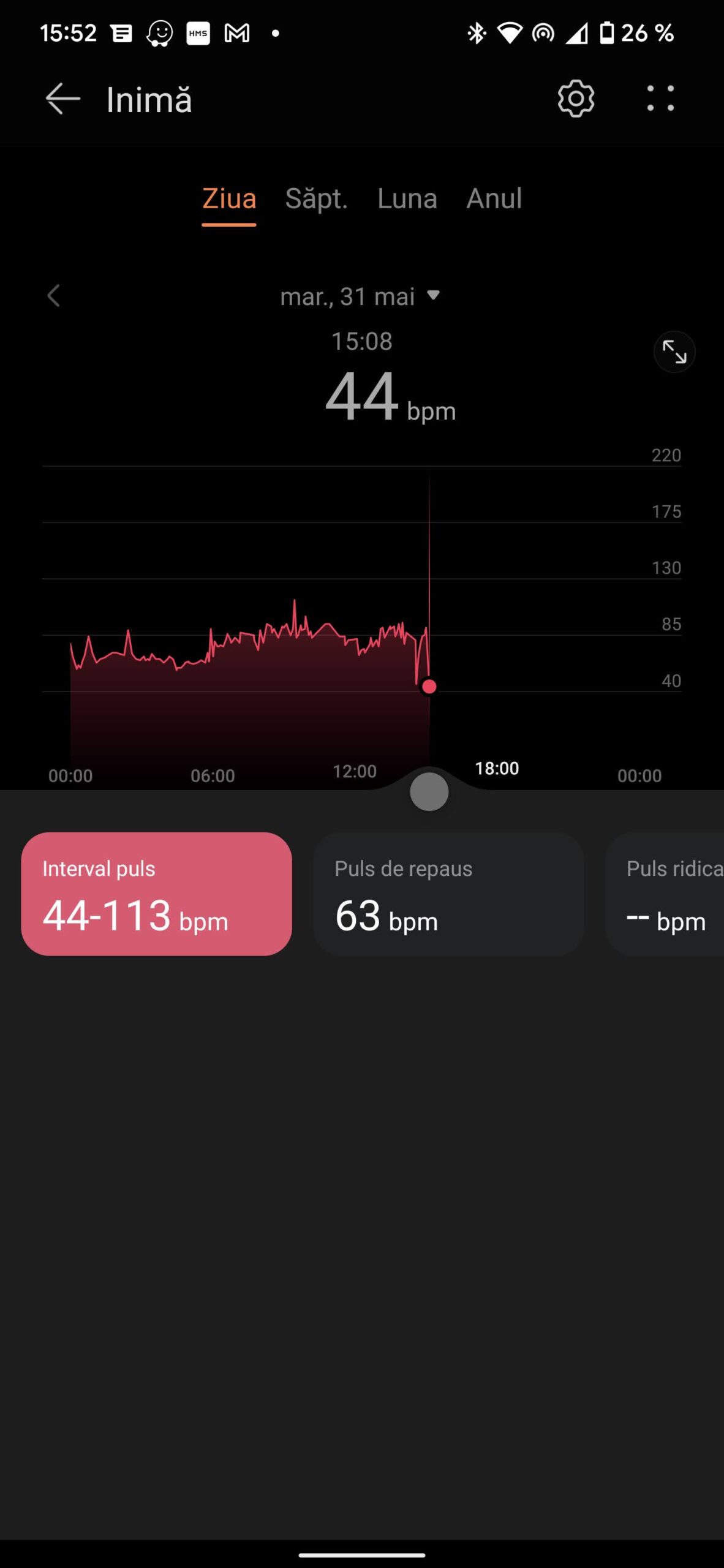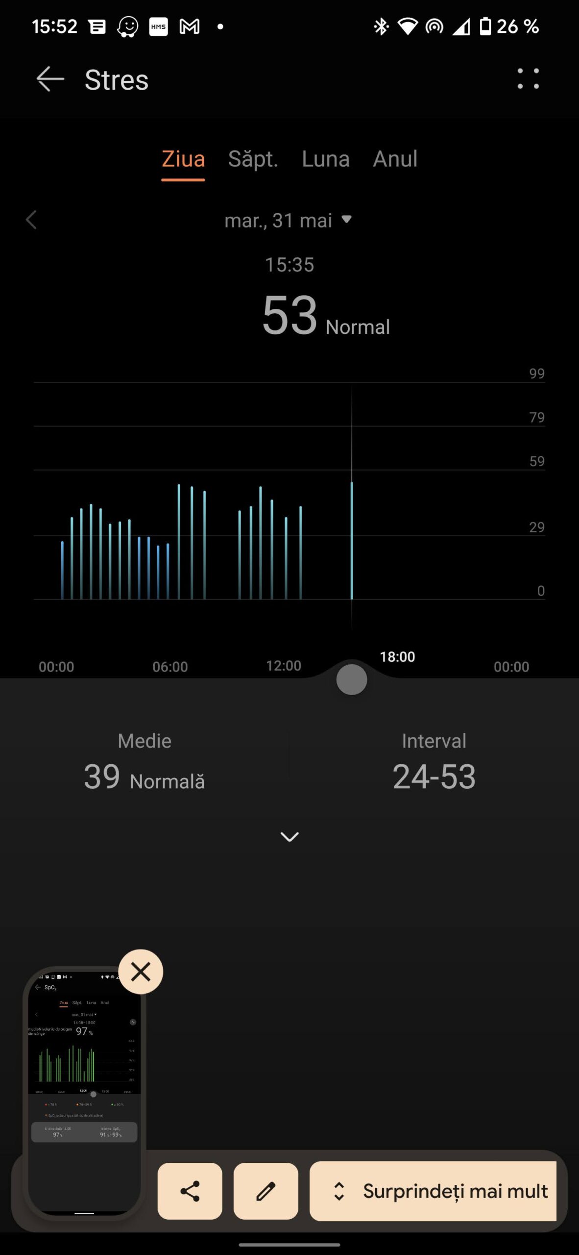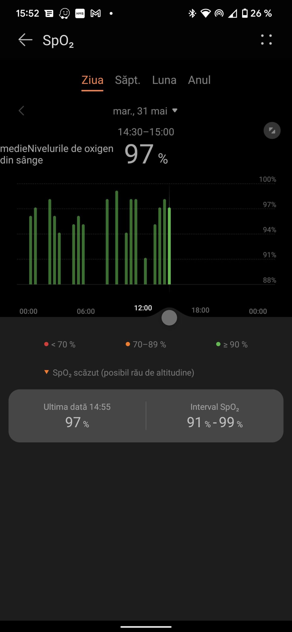 La o glisare de jos în jus, vei găsi notificările pentru care ți-ai dat acordul din aplicație, ca să le primești pe ceas. În stânga Vremea, iar în dreapta vei regăsi ceva mai multe informații: bătăile inimii pe minut, saturația de oxigen, informații despre lună – este în creștere/descreștere, dar și câte ore de somn ai avut în noaptea anterioară. După cum văd meniul nu suferă schimbări.