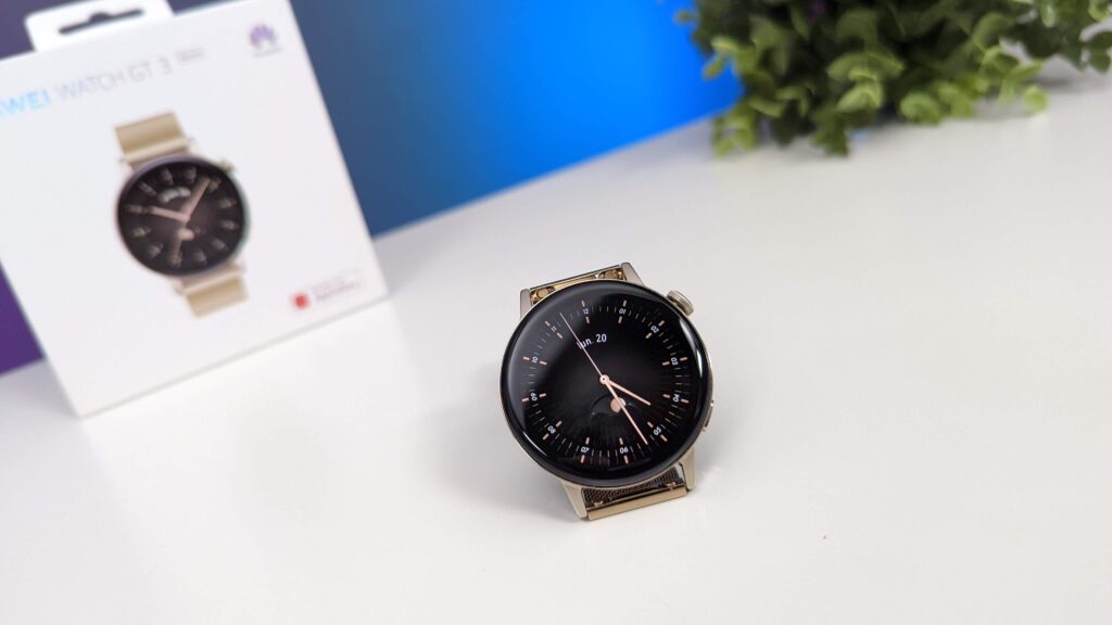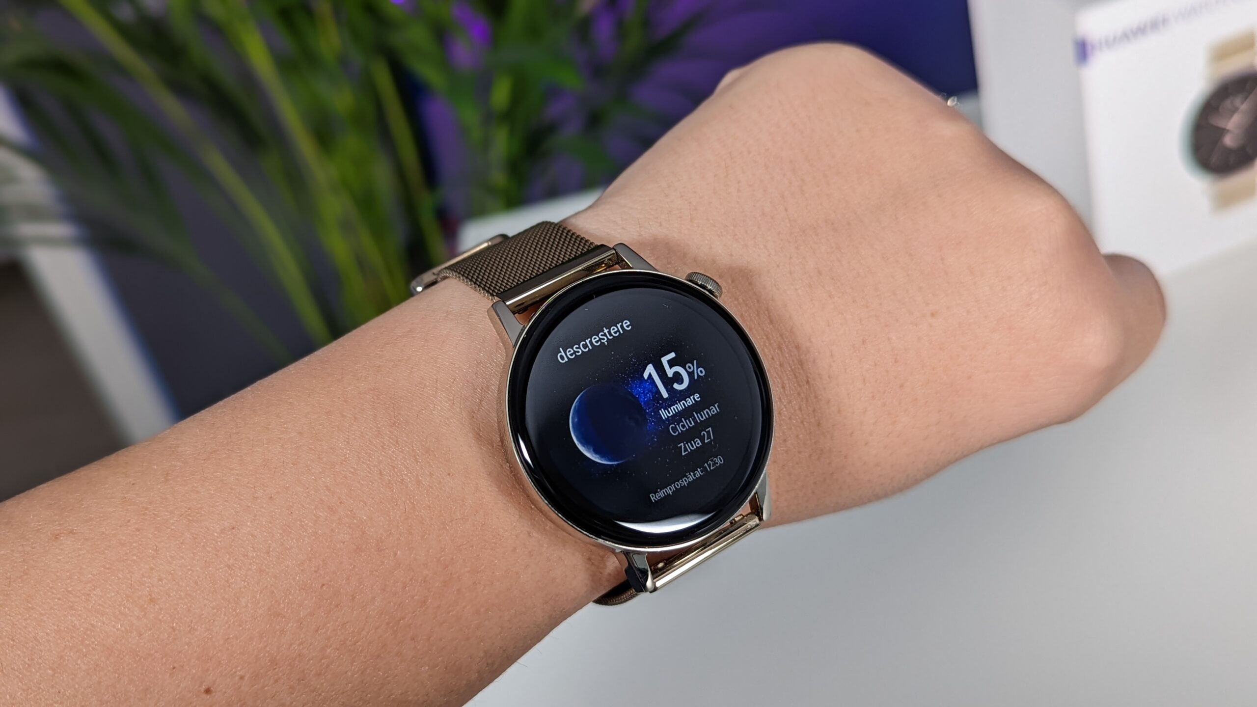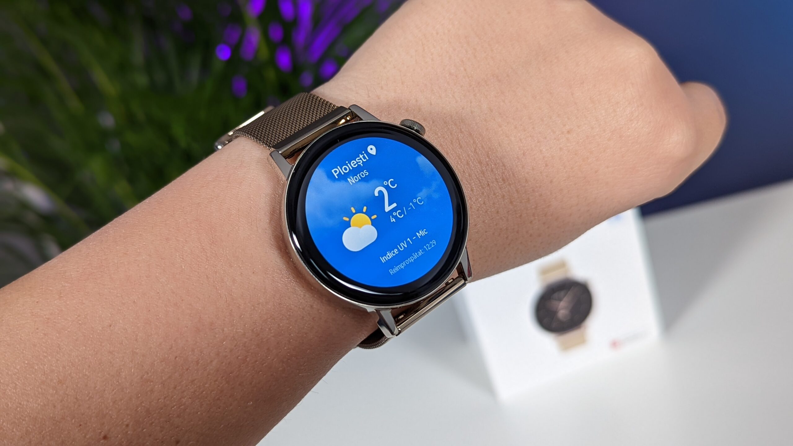 Eu am primit varianta Watch GT 3 Gold Elegant, cea cu curea milaneză, dar domnilor nu părăsiți acest articol căci smartwatch-ul vine și în versiune masculină, cu aceleași funcții și experiențe pe care le voi detalia în cele ce urmează.