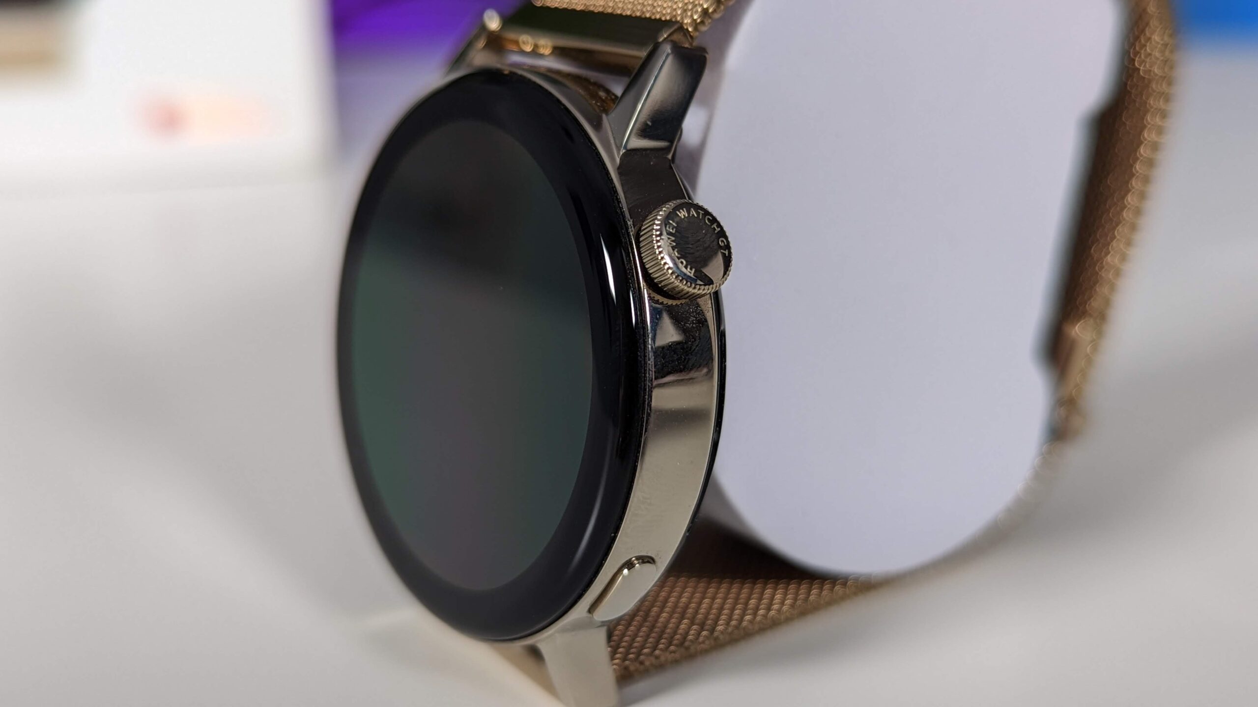 Ceasul iese în evidență prin simplitate și rafinament. Materialele premium și finisajele de excepție fac din acest Watch GT3 o alegere atractivă pentru cei ce sunt în căutarea unui accesoriu de genul acesta. Este o construcție solidă și rezistentă, cu un corp din oțel inoxidabil și ecran din safir, ce pune în valoare încheietura mâinii. La prima vedere duce cu gândul la modelele clasice, fără multe elemente care să îți atragă atenția. Pe laterala dreaptă avem un buton fizic în partea de jos care poate fi customizat după bunul plac, dar și o rotiță cu multiple funcții, în partea de sus. Zoom prin aplicații și scroll la rotire, dar și accesarea meniului la apăsare. Tot pe margine, undeva la îmbinarea dintre spatele din plastic și rama de oțel este prezent și difuzorul, iar pe partea opusă și un microfon.