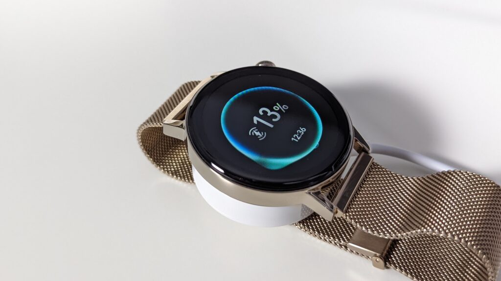 Aici HUAWEI Watch GT3 promite utilizatorilor 7 zile de utilizare. Eu am atins cam 6 zile de utilizare. E adevărat, aici contează mult și intensitatea utilizării lui. Dacă îl folosești doar ca și accesoriu, să mai vezi câteva informații de bază, ai șanse să atingi o săptămână de utilizare. Dacă ești tipul de utilizator sportiv, care își monitorizează constant activitatea fizică și folosești aplicații de muzică, va trebui să te mulțumești cu 4-5 zile de utilizare. Încărcarea se face wireless. Încărcătorul magnetic din cutie se lipește pe spatele ceasului pentru a evita întreruperile de încărcare, dar e bine de știut că ceasul se poate încărca cu orice charger compatibil Qi.
