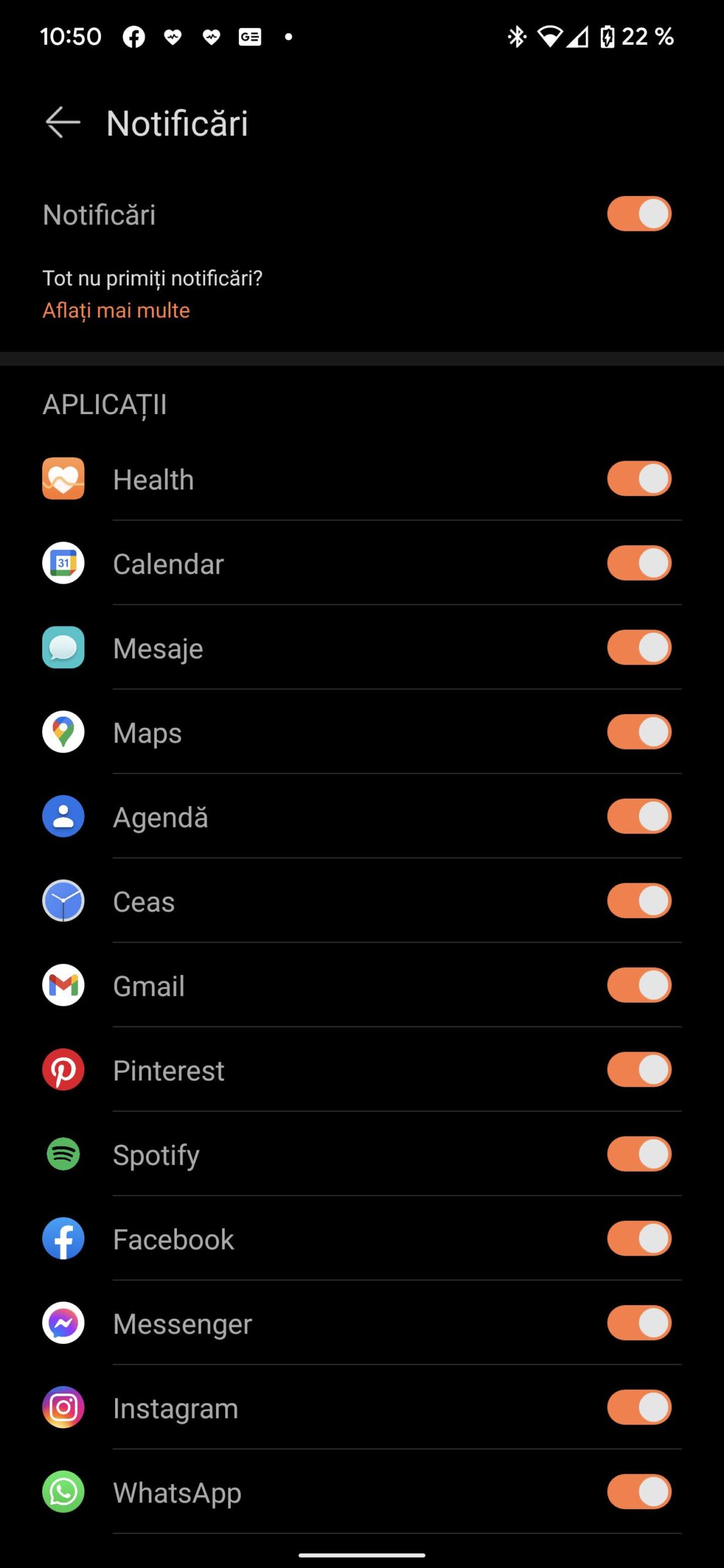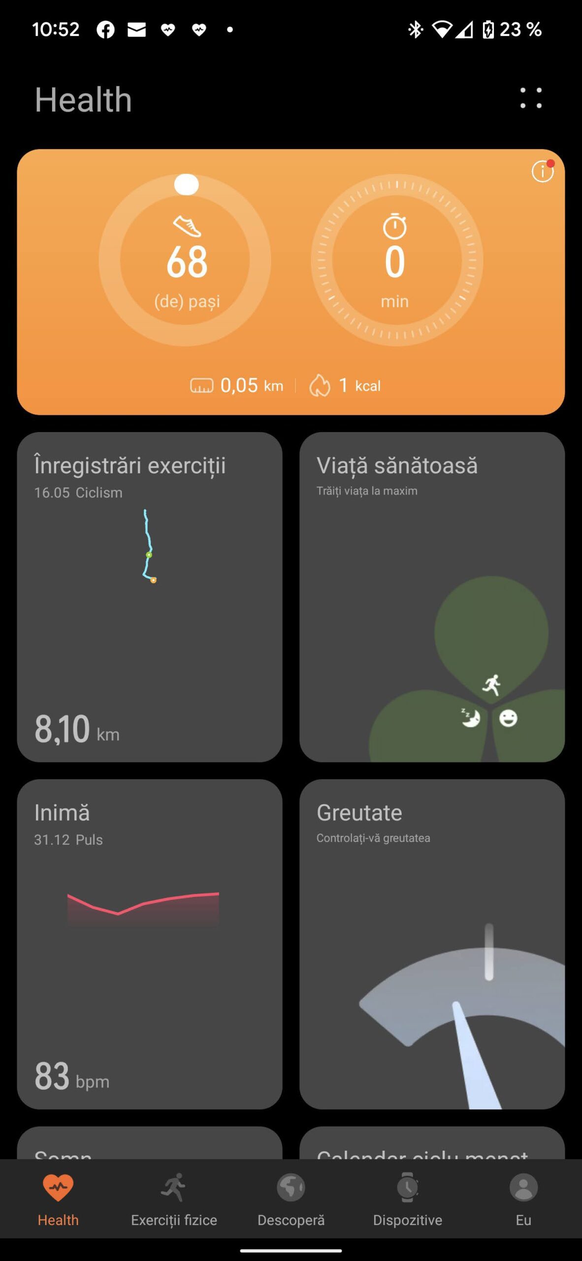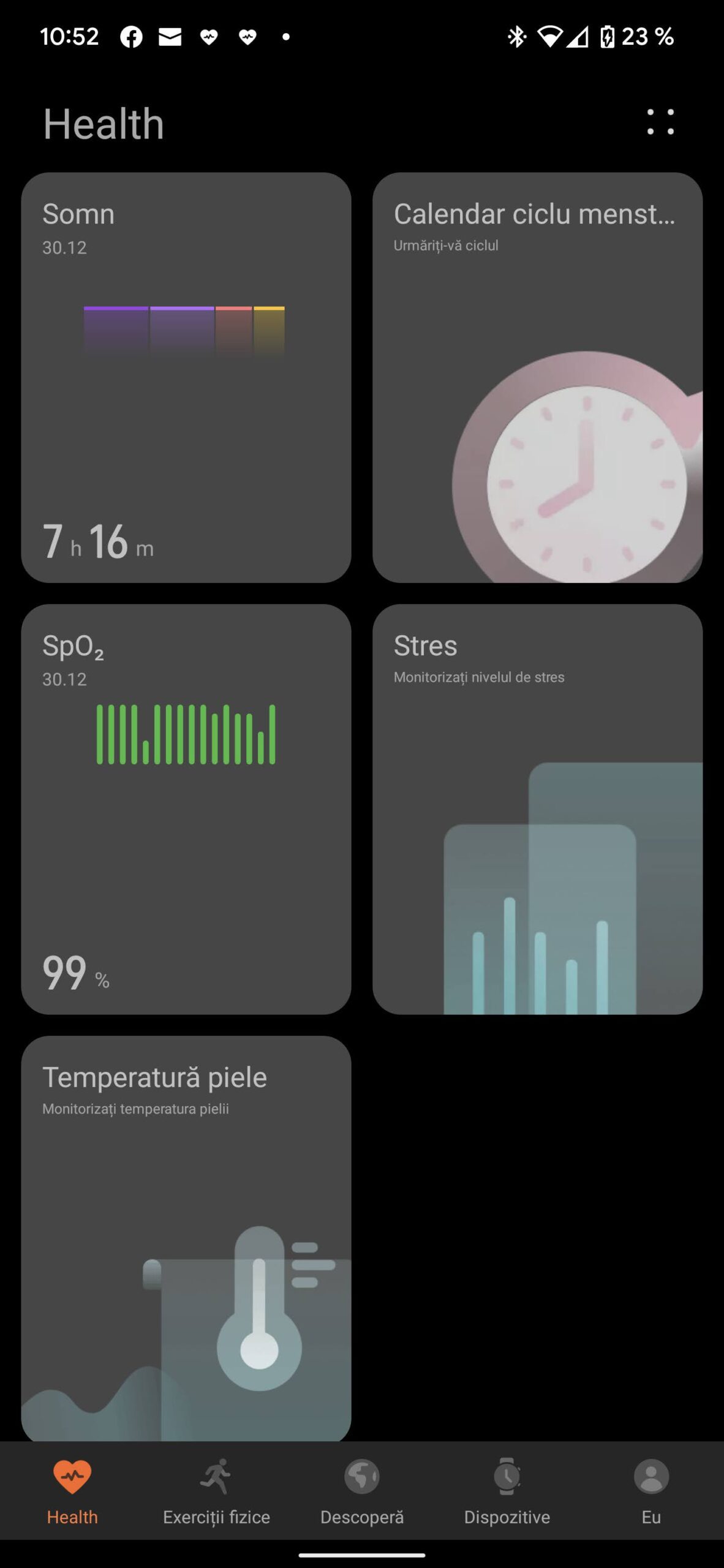 La o glisare de jos în sus vei găsi acele notificări din telefon pentru care ți-ai dat ok-ul să le primești pe ceas. În partea stângă: Vremea, iar în partea dreapta mai multe informații despre sănătate( bătăi pe minut ale inimii, saturația de oxigen din sânge – o funcție utilă mai ales în contextul actual), informații legate de lună – este în creștere/descreștere, precum și câte ore de somn ai avut în noaptea anterioară.