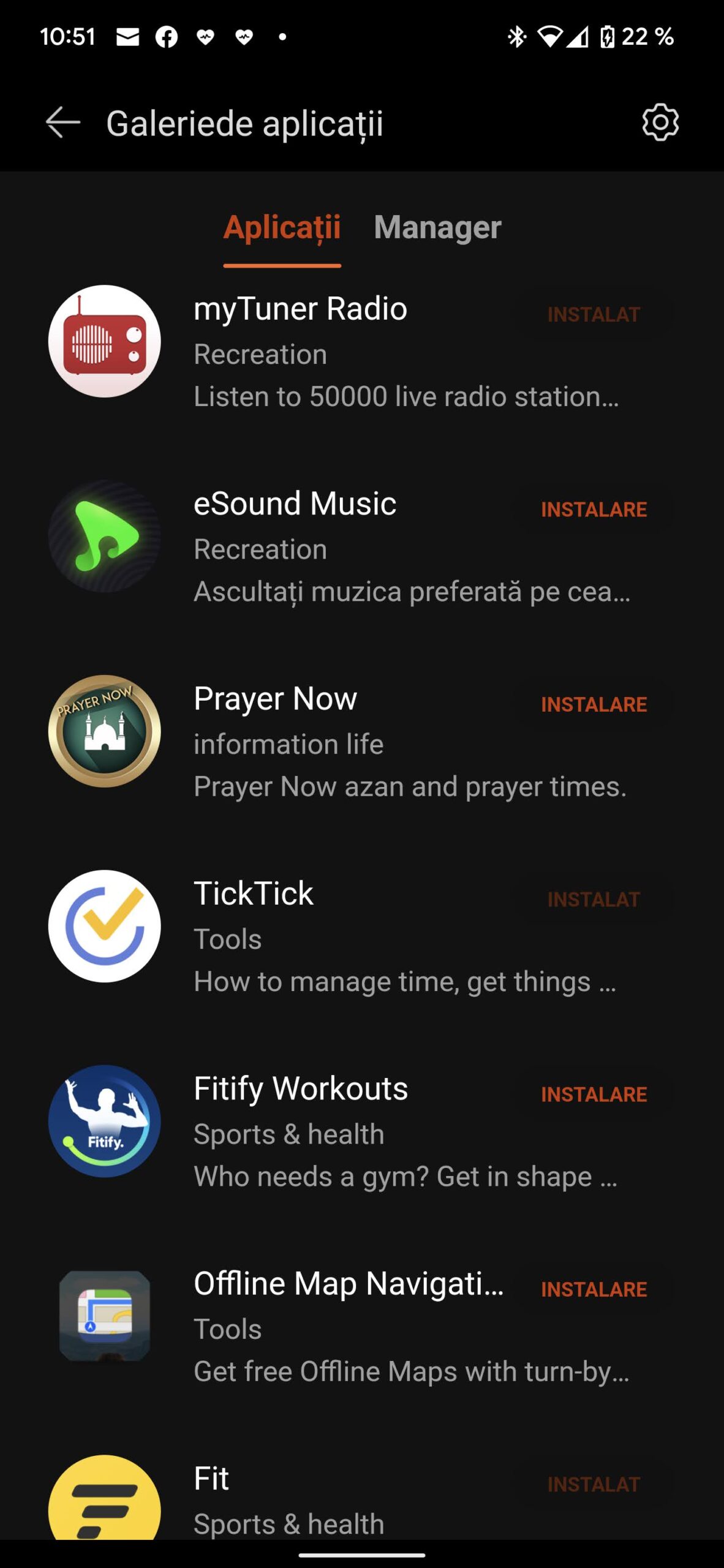 Butonul de jos acționează standard zone de activități sportive, dar se poate remapa din setări cu ușurință. La apăsarea rotiței se deschide meniul cu toate aplicațiile și intrăm în zona cea mai interesantă pentru că de aici se pot face foarte multe chestii. Aici o parte din aplicații vor fi preinstalate, cum ar fi aplicațiile cu care îți poți măsura saturația de oxigen, pulsul, nivelul de stres, activitățile sportive, somnul, temperatura pielii, o chestie pe care am întâlnit-o prima dată pe Huawei Watch 3, și lista poate continua cu aplicații de apelare, ascultare muzică, presiune atmosferică, cronometru, sau alarmă. Ce nu-mi place aici este faptul că uneori am impresia că mă pierd prin iconițele aplicațiilor, căci nu le recunosc chiar pe toate și mi se întâmplă să mai bâjbâi printre ele până îmi dau seama care este care.