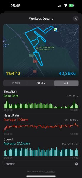 Și pentru că știți că ne plac testele, ei bine Watch GT 5 Pro, versiunea bărbătească, ce are un preț de 2500 lei, a fost folosit de colegul meu într-un test comparativ cu Apple Watch Ultra 2, un smartwatch de 4500 lei, la o tură de 40 Km cu bicicleta. Despre Apple Watch Ultra 2 am tot văzut prin teste cât este de apreciat pentru precizia cu care măsoară sporturile outdoor, așa că am vrut să vedem cum se descurcă un ceas cu 2000 lei mai ieftin în raport cu el, iar rezultatul este surprinzător, aproape același număr de calorii consumat, 1324 vs 1320 kcal. La elevație am văzut că diferența este ceva mai mare. Îți las rezultatele aici pe ecran, pentru a le vizualiza și tu mai bine.