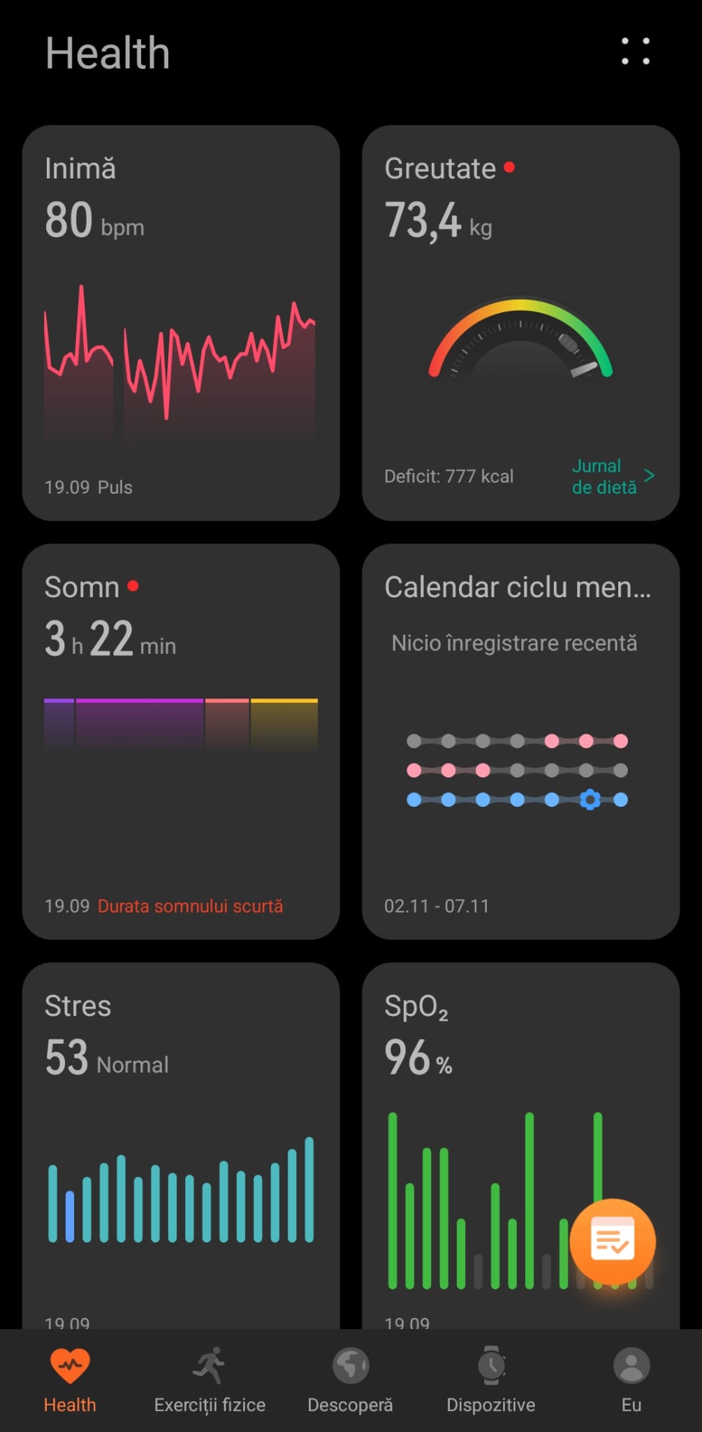 Ca și la celelalte modele Huawei, și acesta are meniul la fel de intuitiv și ușor de parcurs. La o glisare de jos în sus, avem notificările pentru care îți dai acordul din aplicație ca să le primești pe ceas. În stânga avem vremea, iar în dreapta ceva mai multe informații, obiective stabilite și măsurarea lor pe parcursul unei zile, apoi găsim un widget care conține informații despre starea de sănătate a utilizatorului, despre calitatea somnului, nivelul oxigenului din sânge și altele. Mai ai un widget cu calendar, jurnal de apeluri și muzică, încă unul pe bază de sport și încă unul cu fazele lunii.