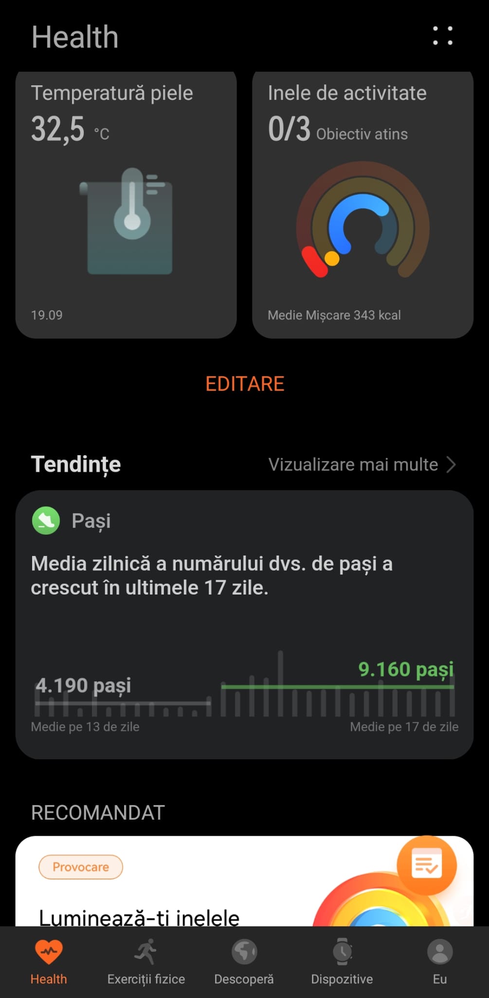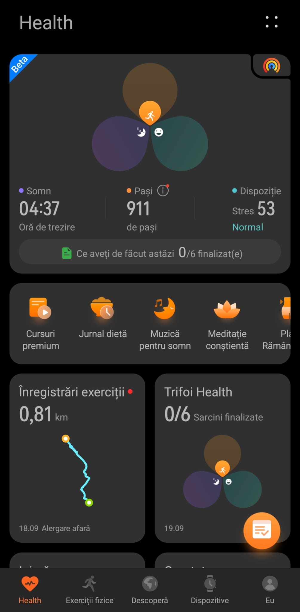 Huawei introduce 14 fețe noi pe modelul Pro, iar multe dintre ele sunt dinamice. Îmi place în special Blooming Brilliant, o față de ceas animată care arată progresul activității fizice prin deschiderea unei flori pe parcursul zilei. E un detaliu mic, dar care face experiența mai interactivă. Comparativ cu GT 3 Pro, GT 5 Pro aduce o interfață mai fluidă și mai bine optimizată pentru utilizarea zilnică, cu tranziții mai rapide și o structură a meniului mai intuitivă. Fețele ceasului se pot schimba printr-o apăsare lungă, pe ecran, după care swipe în dreapta pentru a alege ceea ce ți se potrivește. În plus odată ce ai stabilit fața care îți place, o poți personaliza după bunul plac.