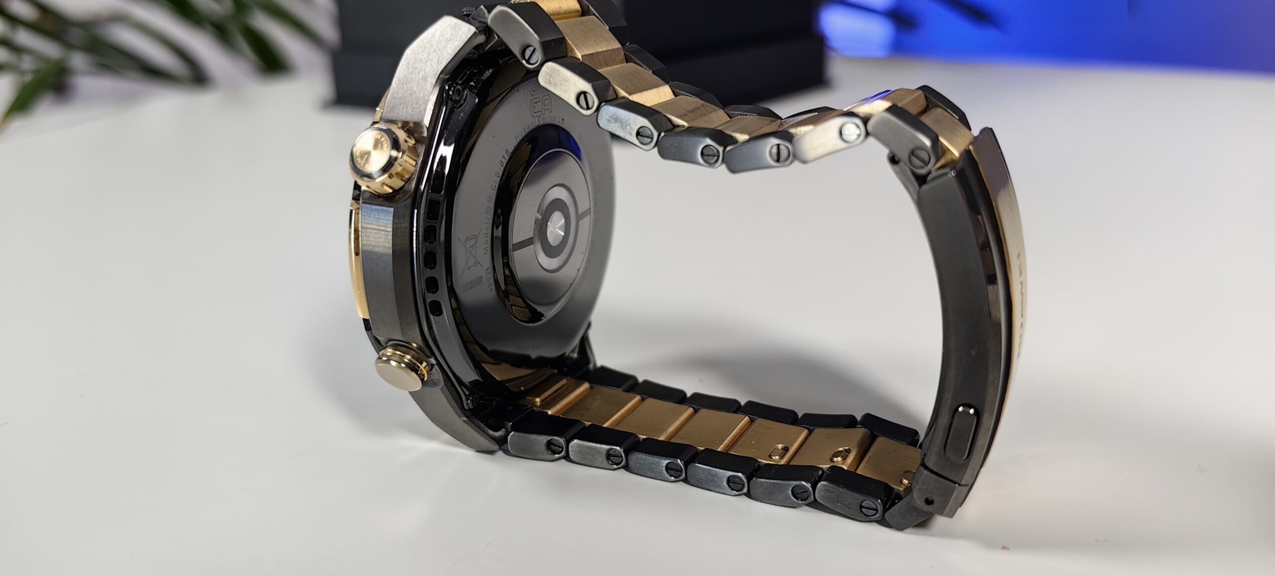 Așa cum îți spuneam mai devreme, aurul este un metal moale, de aceea a fost prelucrat în diferite moduri, pentru a deveni mai rezistent, astfel încât să nu se zgârie cu ușurință. Rotițele de pe cadran sunt tot din aur, însă nu integral. Elementele sunt din titan, acoperite de un înveliș din aur de 18K, tot pe motiv de rezistență. Pe spate avem ceramică, iar aici sunt găzduiți senzorii pentru măsurători. Părțile de care se prinde cureaua sunt dintr-un metal lichid, iar brățara este realizată din titan placat cu aur. Tot despre curea îți voi spune că este specială, are o închidere fluture reglabilă, patentată de Huawei. Mai exact e vorba de un mecanism, pe care nu l-am mai întâlnit până acum la alte ceasuri smart, ce îți permite să ajustezi dimensiunea brățării prin apăsarea unei clapete din interiorul prinderii. Și abia apoi, după ce ai făcut aceste ajustări și nu a fost suficient, poți apela și la rezervele de zale din cutie dacă este necesar. Și aici mecanismul este ușor, așa încât să nu ai nevoie de nici un alt accesoriu pentru acest proces. Doar tragi de trăgaci și brățara se desface.