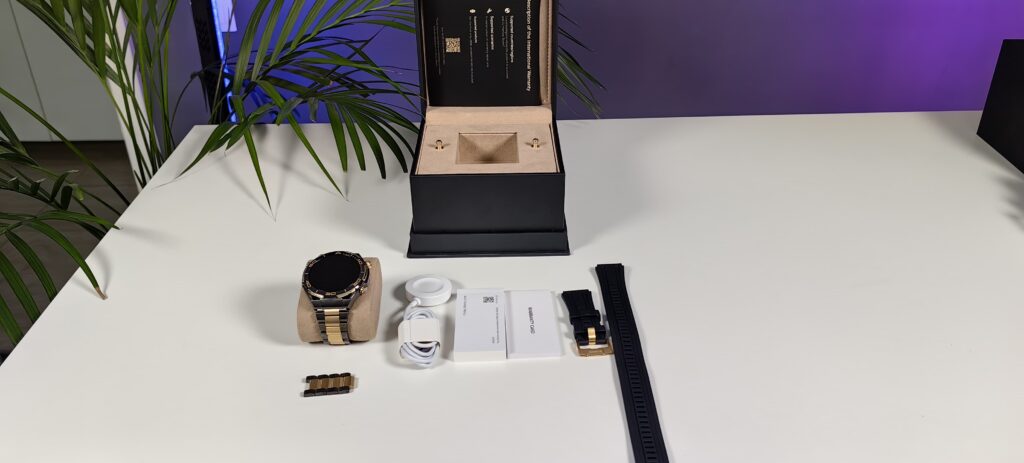 Tot în cutie mai găsim și două cutiuțe îmbrăcate în alcantara. Atenția la detalii se vede din plin. Într-una din cutiuțe găsim manualul de utilizare, garanția și încărcătorul magnetic, cu care suntem deja familiarizați de la celelalte smartwatch-uri, plus o cârpă de șters, iar în cealaltă cutie avem câteva zale de rezervă, pentru cei cu încheietura mai mare și două curele din silicon cu elemente placate cu aur, ideale pentru sport sau de ce nu pentru scufundări, căci ceasul este un companion bun chiar și pentru cei ce practică această activitate. Așadar un pachet complet, pentru ca ceasul să fie purtat în orice condiții.