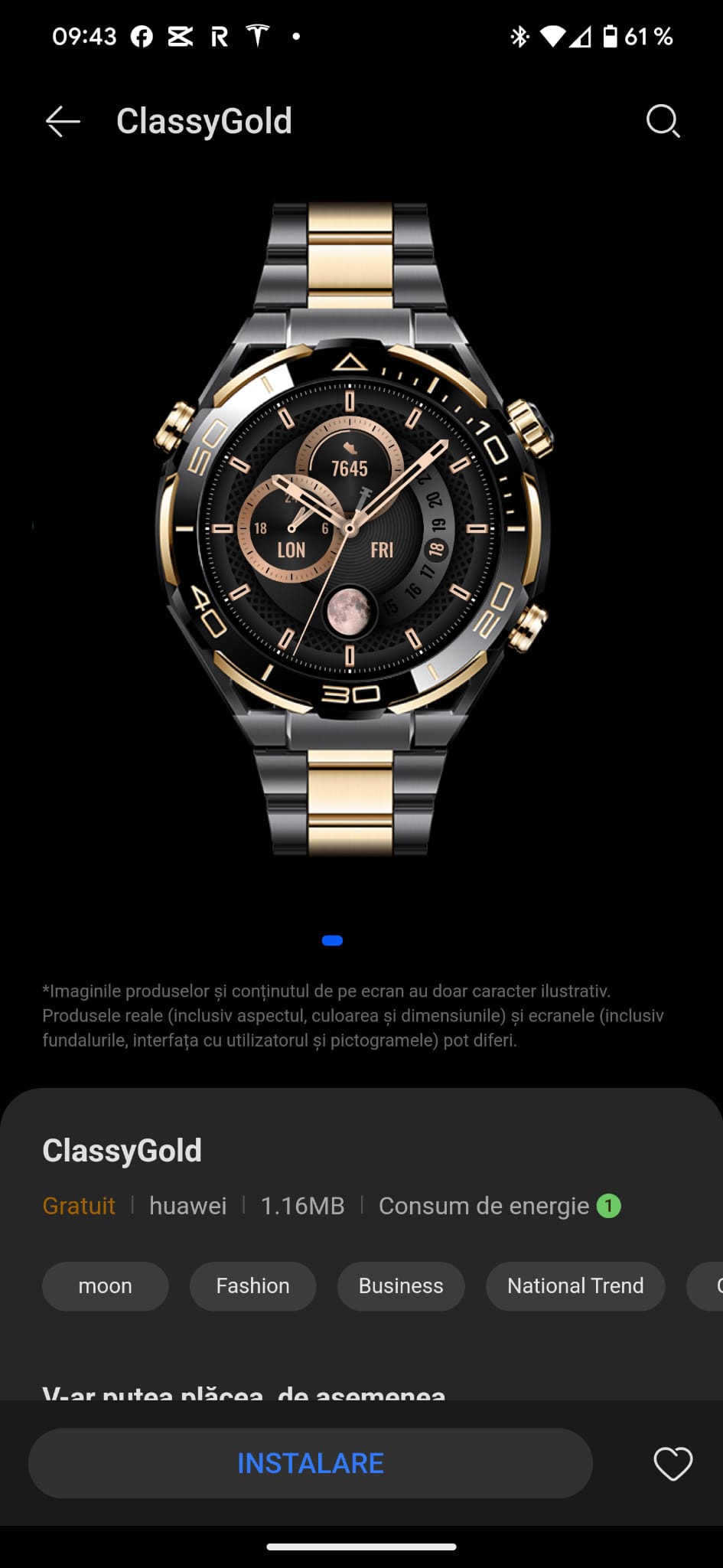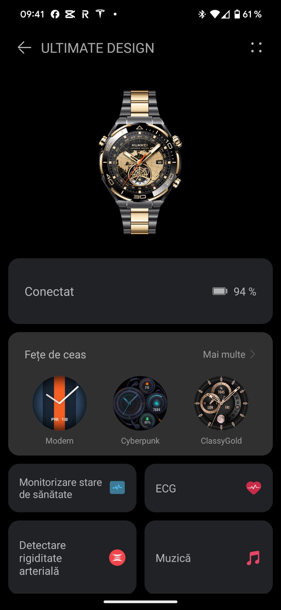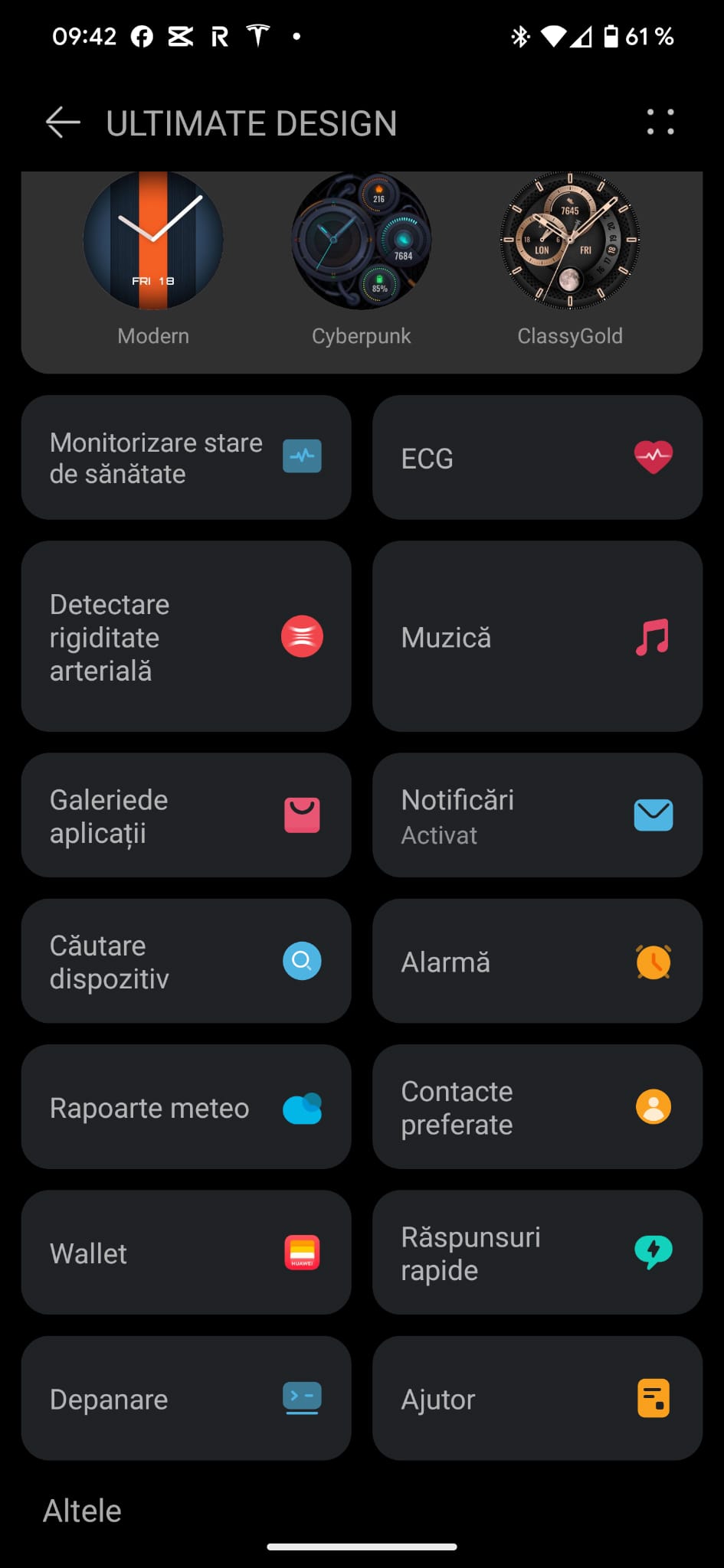 Vine și cu acest meniu gold, ca să fie în concordanță cu design-ul spectaculos al ceasului, însă dacă vrei să îl schimbi și să revii la acel meniu colorat, cu care Huawei ne-a obișnuit, o poți face direct din setările de pe ceas.