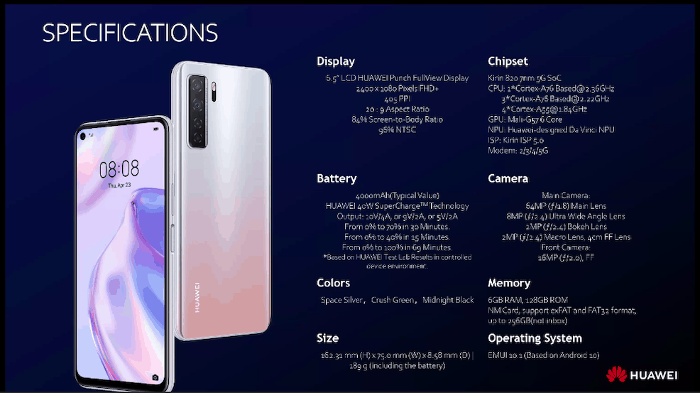 Are o diagonală de 6,5 inch, cu o rezoluție 2400 x 1080 pixeli, suport HDR10, iar la interior este animat de noul procesor Kirin 820 5G, tactat la 6 GB RAM, cu 128 GB memorie internă. Primește o baterie de 4000 mAh, cu încărcare rapidă la 40W.