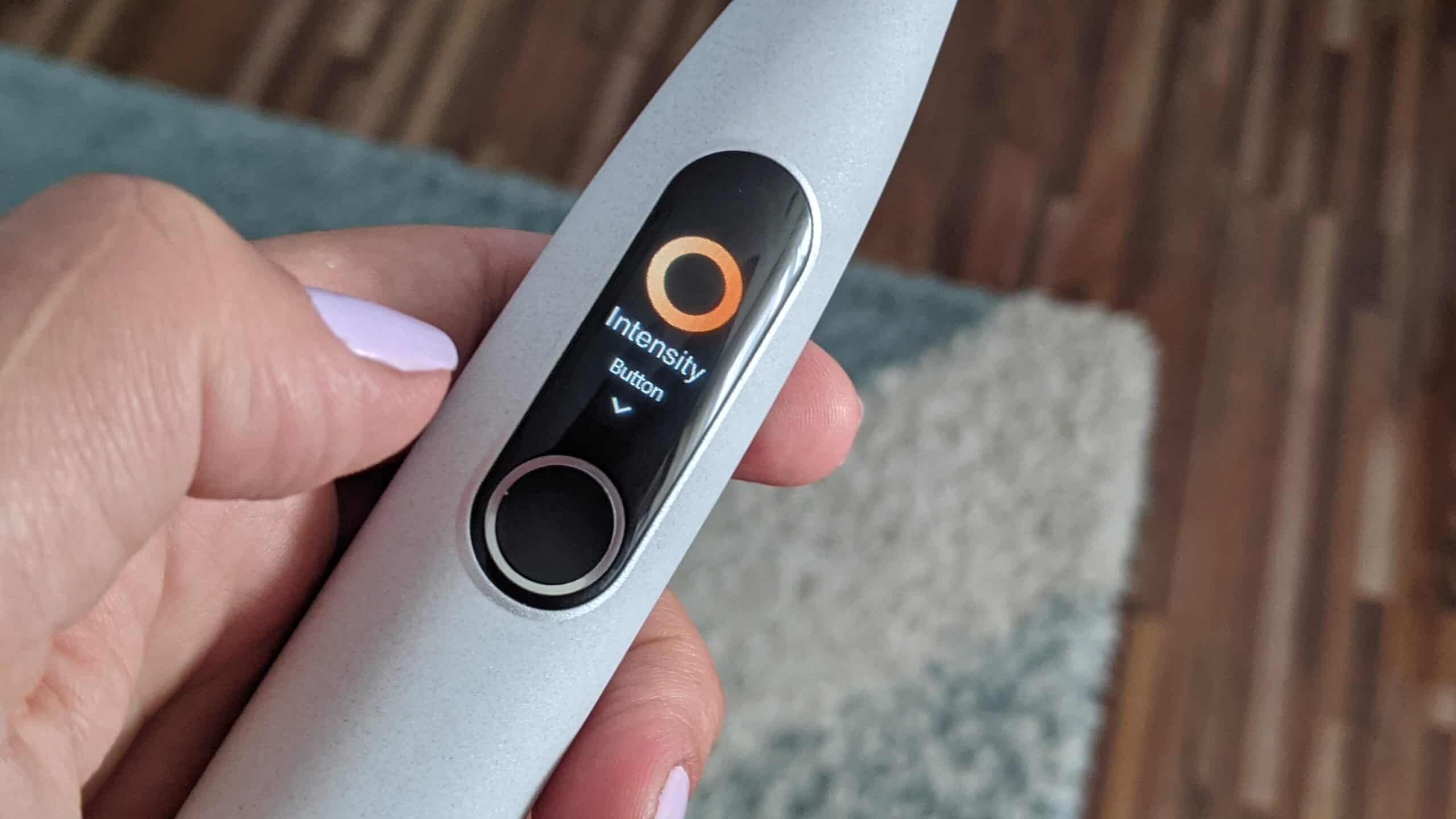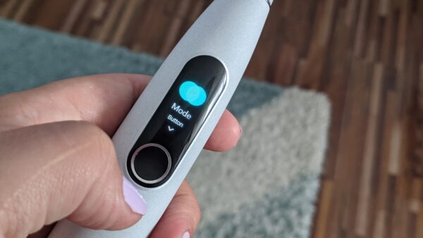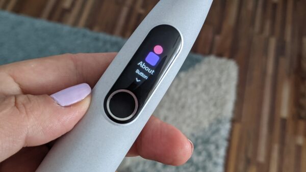 Display-ul este color și afișează 4 categorii: About(aici dacă apeși pe butonul de control îți afișează modelul, ce versiune rulează și faptul că avem de-a face cu un model rezistent la apă), Time(aici ai posibilitatea să setezi manual între 2 și 3 minute pentru sesiunea de periaj ), Intensity(aici poți selecta din 4 tipuri de intensitate) și Mode(ai 4 moduri de curățare a dinților din care să alegi: Clean, White, Massage, Sensitive). Odată selectat unul dintre aceste moduri, el îți va apărea de fiecare dată când vei accesa meniul periuței de dinți. Pentru începerea și terminarea periajului folosești butonul de control. Iar la final display-ul îți va afișa cât de corect a fost periată dantura, timpul de periaj și scorul obținut pentru periaj.