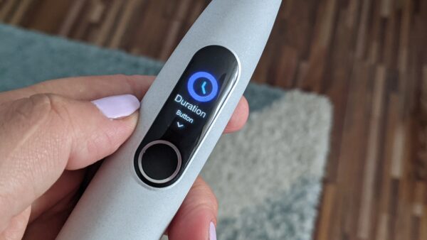 X Pro Elite este o periuță care impresionează în primul rând printr-un design stilish. Vine în nuanța Grey Limestone și are o textură ușor abrazivă, care duce cu gândul la pietrele de pe plajă. Periuța arată și se simte premium. Față de modelul Oclean X, al cărui review va veni și el în curând, pentru X Pro Elite se vede o mai mare atenție la detalii, cum ar fi textură, elementele de culoare metalică, ce creează un contrast perfect + îmbunătățirile aduse pe partea de tehnologie.