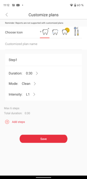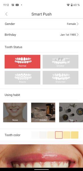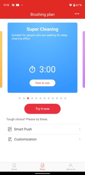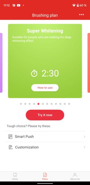 Și asta nu e tot. Din aplicație poți face câteva customizări interesante ale periajului, în funcție de ceea ce te interesează: să ai dinții curați, să fie curățați în profunzime, albirea lor, dantură sensibilă, periaj corespunzător în caz că ai aparat dentar + alte opțiuni din care să alegi. Fiecare alegere vine și cu indicațiile corespunzătoare pentru a atinge rezultatele dorite. Tot aici vei mai găsi și opțiunea Smart Push, pe care dacă o vei selecta, te va invita să completezi câteva date, după care îți sugerează ce mod de periaj ar trebui să folosești. De asemenea poți face customizări pentru periaj. Poți adăuga pași, timpi, moduri de curățare, niveluri de intensitate(are până la 32 de niveluri de intensitate). Din secțiunea About Me, vei putea selecta limba în care să îți fie afișate informațiile pe display-ul periuței, vei putea face update-uri + alte câteva chestii.