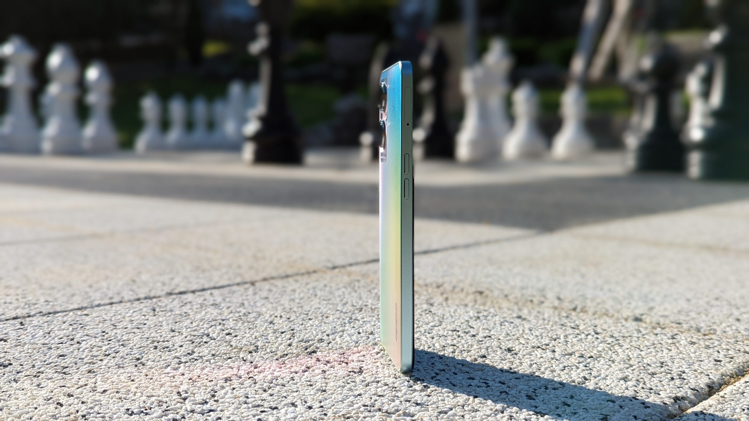 Oppo Reno 7 Lite este un telefon ce atrage de când îl scoți din cutie. Arată și se simte bine în mână. Ecran drept, rotunjit frumos doar la colțuri, subțirel în talie, doar 7,5 mm, cu un spate plat, telefonul se așează bine în mână. Poate fi folosit cu o singură mână, fără mari emoții, căci are un grip bun și asta mai ales datorită faptului că producătorul a ales acest design cu linii drepte, care duce cumva cu gândul către iPhone. Ultimul telefon pe care l-am putut așeza așa în poziție verticală, fără a-l sprijini de ceva, a fost iPhone 13, doar că Oppo Reno 7 Lite este ceva mai subțirel. În primă fază am avut senzația că spatele este realizat din sticlă, dar de fapt avem de-a face cu un policarbonat foarte calitativ, mat, ce pare a fi sablat. Îmi place că nu reține deloc amprentele și nu este alunecos. Nici nu scârțâie atunci când pui presiune pe el, așa cum am mai văzut la alte telefoane din zona aceasta buget. Dacă nu aș ști prețul lui, aș avea senzația că este mult mai scump.