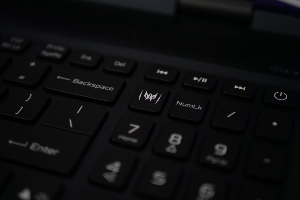 Tastatura este confortabilă, potrivită pentru o utilizare îndelungată. Blocul numeric este și el prezent. Aici vei găsi o comandă rapidă Predator Sense, care deschide aplicația și permite comutarea între diferite moduri de performanță. TouchPad-ul este unul standard, foarte responsive, însă cu siguranță în mare parte veți folosi un mouse de gaming.