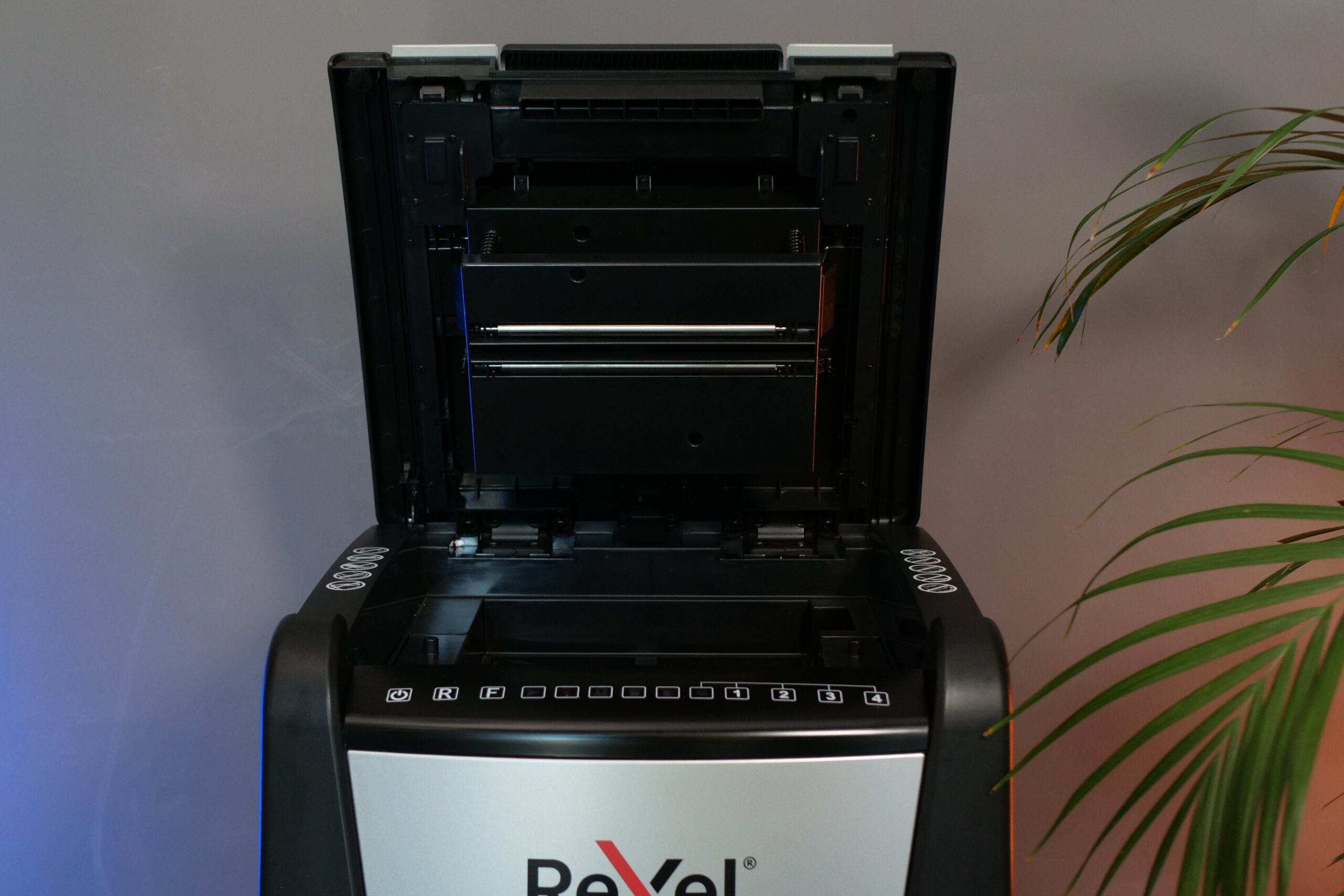 Distrugătorul de documente este ușor de folosit. Vine cu un panou de control tactil, destul de intuitiv. De la stânga la dreapta, avem așa: Butonul Power, Butonul Reverse, cel care îți permite să scoți hârtia introdusă prin prin alimentarea manuală, butonul de înaintare manual, indicatorul Gata de utilizare, indicatorul de supraîncălzire, indicatorul de supraalimentare/sau de blocare(când se aprinde acest buton trebuie să reduci numărul de coli sau să îndepărtezi elementul care blochează distrugătorul). Mai avem și indicatorul pentru coș plin(are un senzor cu infraroșu pentru indicarea gradului de umplere a recipientului de colectare), indicator ușă deschisă(acesta se aprinde când nu ai introdus coșul corespunzător). Mergem mai departe și vedem indicatorul pentru ușă de alimentare blocată, iar cele 4 numere sunt prezente pentru a forma un cod de siguranță necesar la blocarea ușii.