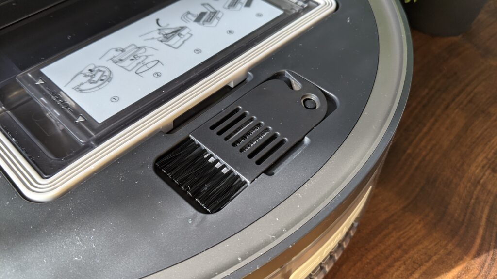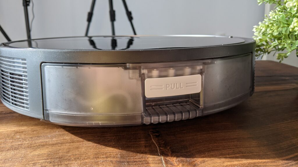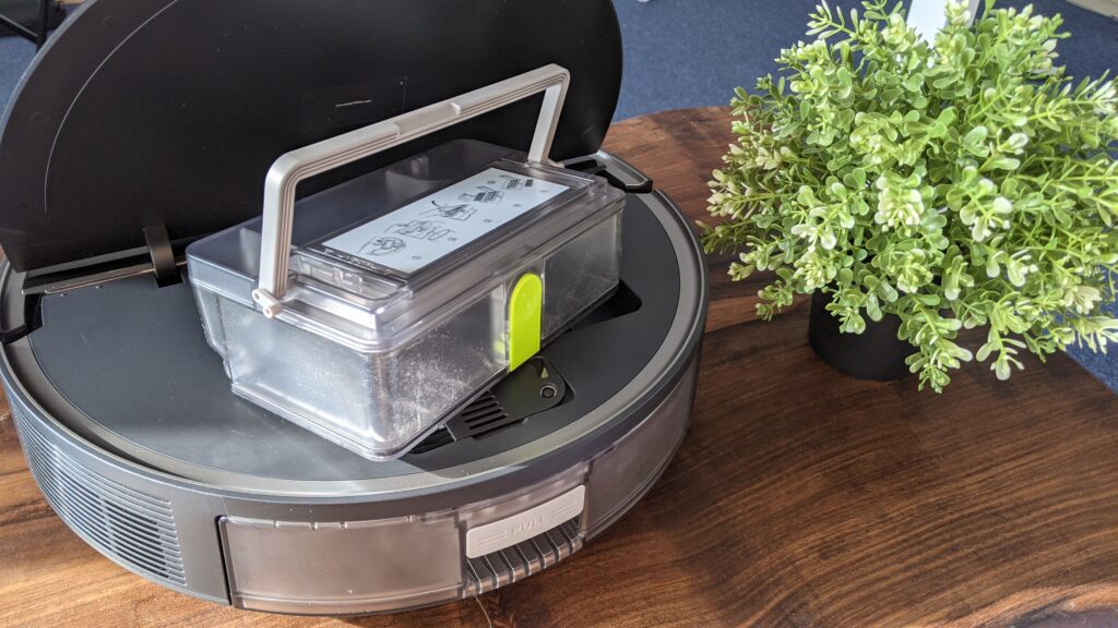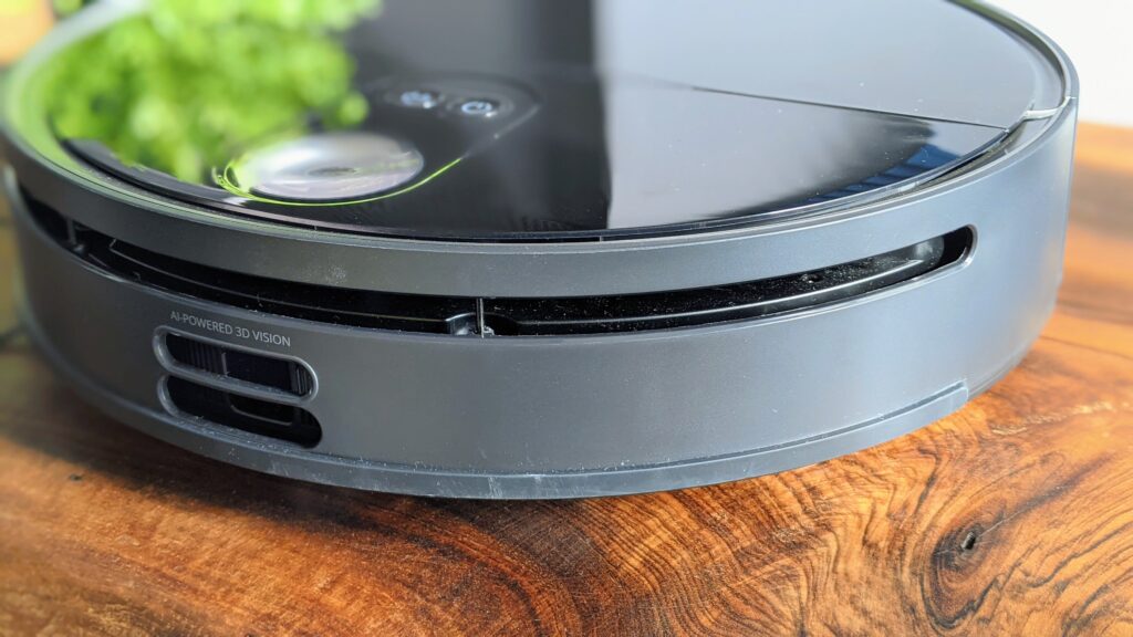 Senzorii LIDAR folosesc de data aceasta noua tehnologie Direct Time of Fligth, care spre deosebire de tehnologia LDS tradițională este mult mai eficientă. Deasupra se păstrează în continuare butoanele fizice, cel de pornire/oprire și butonul home pentru alimentare. Recipientul de colectare este destul de generos, are o capacitate de 0,5 l. Se scoate și se așează pe poziții cu ușurință, iar golirea lui este extrem de simplă, apeși butonul acesta și gata, gunoiul pică, fără a fi nevoit să te atingi de el. Pot aspira fără probleme un apartament de 60 mp, cam de 3-4 ori, după care senzorul mă anunță când ar trebui să îl golesc. Filtrul HEPA este protejat de un strat de pânză care împiedică îmbâcsirea lui rapidă.