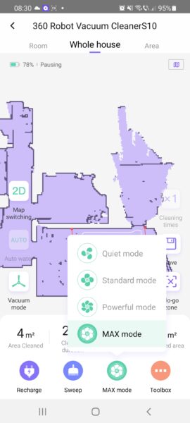 La partea de mop, am vrut să văd cum se descurcă cu petele uscate, așa că am turnat cafea, am lăsat-o să se usuce, am pornit modul auto la partea de mop, astfel încât roboțelul să își dozeze singur apa în funcție de suprafața pe care o șterge și după cum puteți vedea se descurcă grozav.