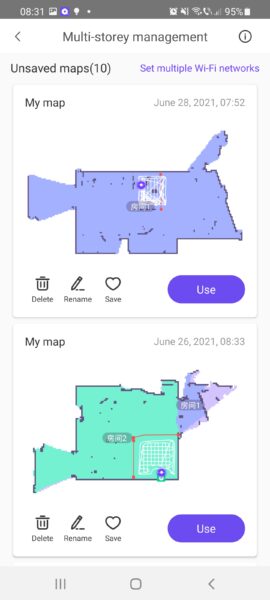 7. Managementul hărților – aplicația îți oferă posibilitatea de a salva mai multe hărți. La ce te ajută? În caz că ai o locuință cu etaj, vei putea salva hărțile pentru fiecare etaj în parte. Poate crea hărți chiar și în zone cu semnal Wi-Fi slab, ceea ce înseamnă că ar putea mapa și subsolul pentru a-l curăța.