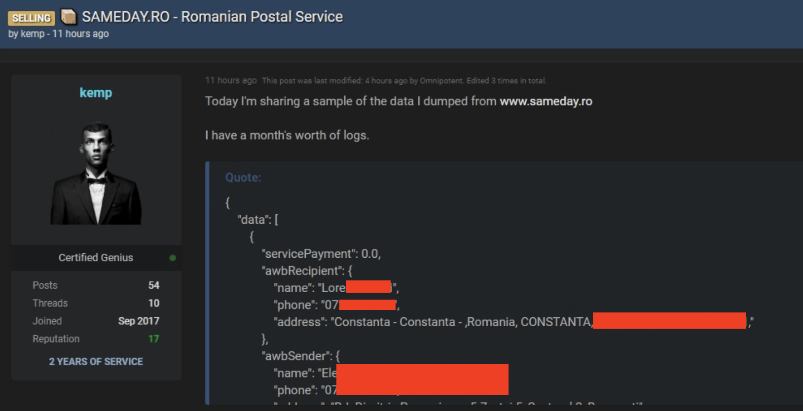 În plan local, Sameday tocmai a devenit victima hackerilor. Baza de date a companiei a fost spartă, un dump de date pe o perioadă de cel puțin o lună fiind vândută pe RaidForums, de un utilizator. Pentru a fi cât mai credibil, acesta oferea și câteva date concrete: informații despre destinatar și expeditor – nume, adresa, număr de telefon, număr de AWB, metoda de plată etc. Mai mult de atât „vânzătorul” se laudă că are și alte pachete de date de vânzare, ceea ce este îngrijorător.