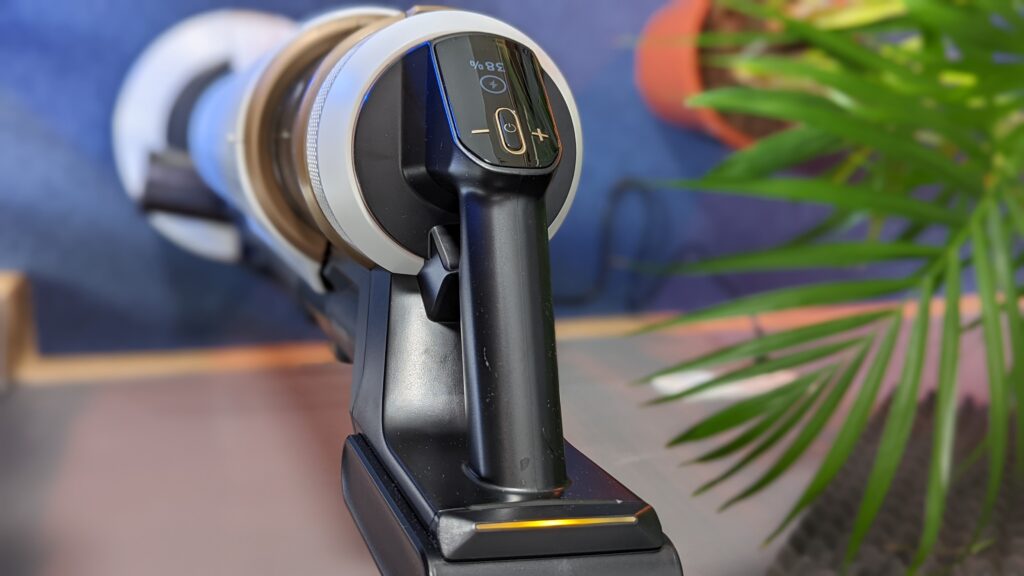 Așadar, în cazul în care ai o locuință cu o suprafață generoasă, este posibil ca un singur acumulator să nu fie suficient pentru o aspirare completă. Partea bună ar fi faptul că poți suplimenta cu încă un acumulator extra, fie poți opta pentru unul din celelalte două modele ale seriei, ce includ o baterie suplimentară în pachet. Partea proastă este că nu vei găsi decât un singur cablu de alimentare în cutie, deși suportul pentru accesorii funcționează și ca dock de încărcare a bateriei. Așadar dacă ai de gând să încarci două baterii simultan, va trebui să achiziționezi suplimentar un astfel de cablu.
