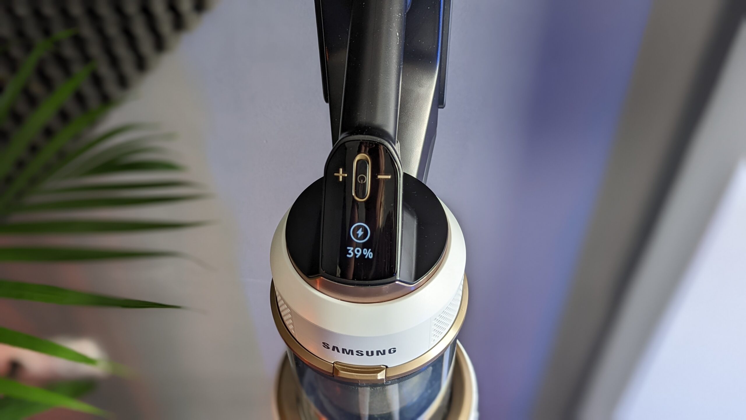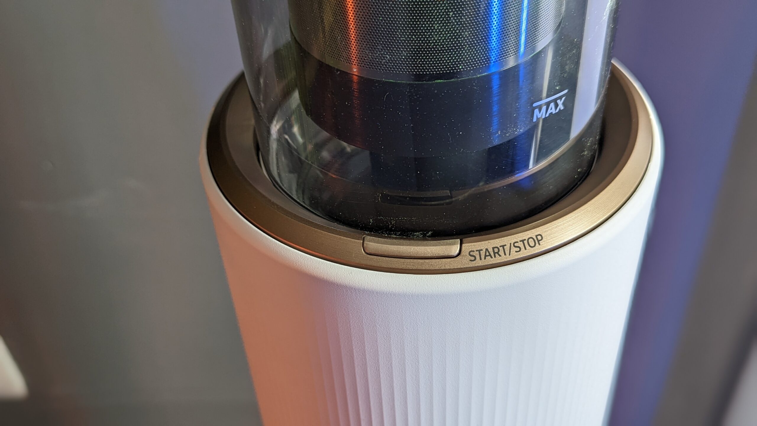 Bespoke Jet este de departe cel mai frumos aspirator vertical pe care am pus mâna până acum. Elegant, fin, aspiratorul nu mai trebuie ascuns într-un dulap după ce-și face treaba. Acum poate să se integreze perfect în decorul locuinței, căci design-ul său este chiar spectaculos. Cu siguranță va fi un magnet de întrebări și curiozități venite din partea celor ce-ți vor trece pragul. Se vede atenția la detalii. Varianta pe care noi o testăm este o combinație de alb, cupru și negru, însă celelalte două modele vin pe verde și albastru. N-aș putea spune că unul este mai frumos ca altul. Cred că este o chestiune de gusturi. Ce pot spune însă, este că Samsung știe să pună în valoare un astfel de produs și să te facă să întorci privirea după el . La prima vedere, îți dai seama că ai de-a face cu un device solid, căci stația de curățare are o greutate considerabilă, 6,7 kg, dar asta pentru a-i oferi stabilitate aspiratorului atunci când se află pe poziții.