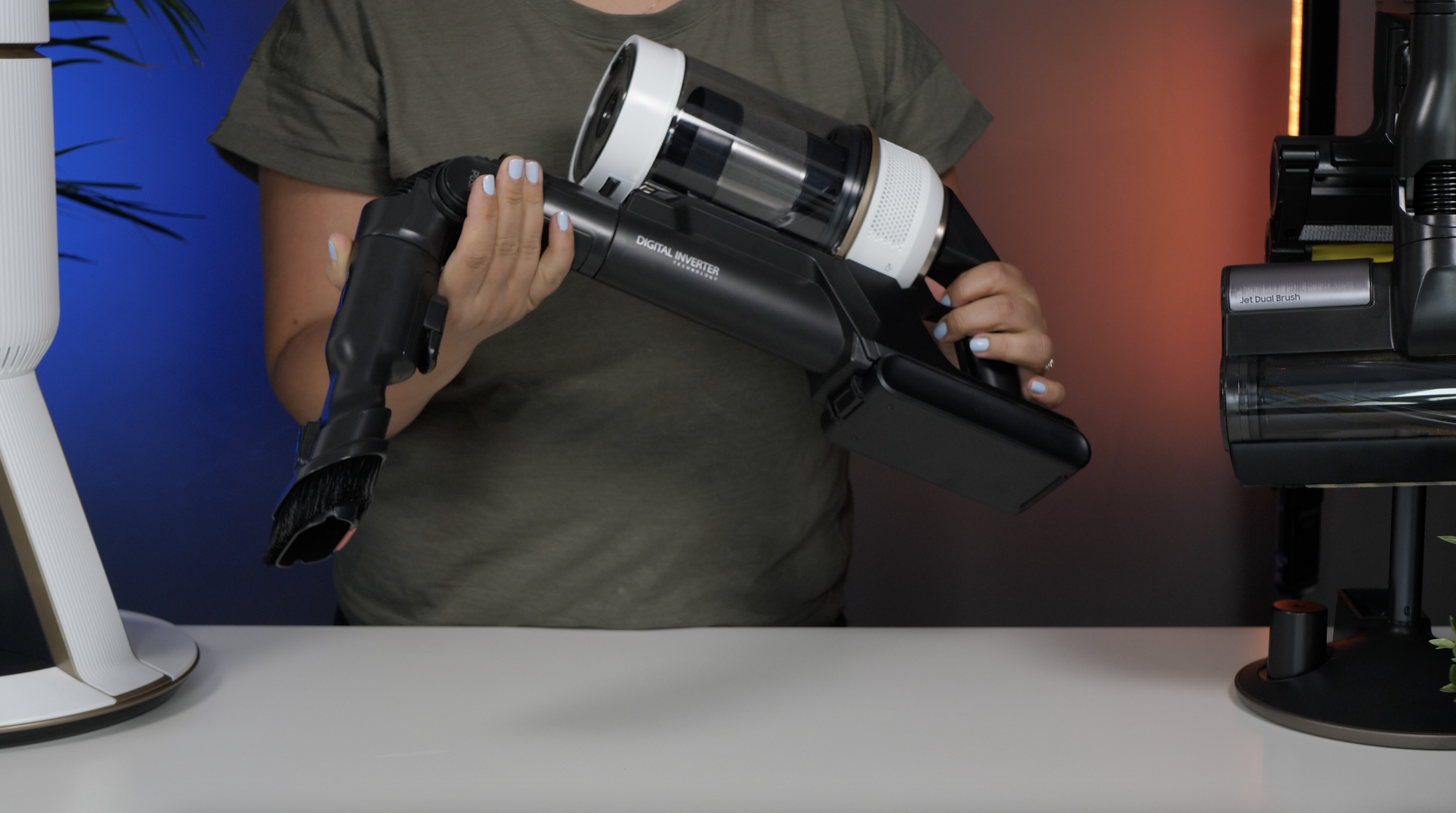 Când vine vorba de aspiratoarele verticale, recipientul de colectare este de regulă o mică bătaie de cap, căci are o capacitate de colectare destul de mică, ce presupune o curățare frecventă a acestuia. În cazul de față avem un aspirator cu o capacitate de colectare de 0,5l. Micuță și aici, dar faptul că aspiratorul vine cu acest All-in-one Clean Station, ce servește și ca suport pentru aspirator, dar în același timp alimentează și bateria aspiratorului, mi se pare o idee practică și eficientă a celor de la Samsung. Golești recipientul instant printr-o simplă apăsare de buton. Cu ajutorul tehnologiei Air Pulse, praful și gunoiul din recipientul de colectare ajung în sacul din stație, rapid, simplu și igienic, fără să fii nevoit să faci asta manual. În plus, se laudă că ar prinde până la 99,99% din praful și particulele fine în sacul antibacterian, pe care îl îndepărtezi cu ușurință atunci când e plin.