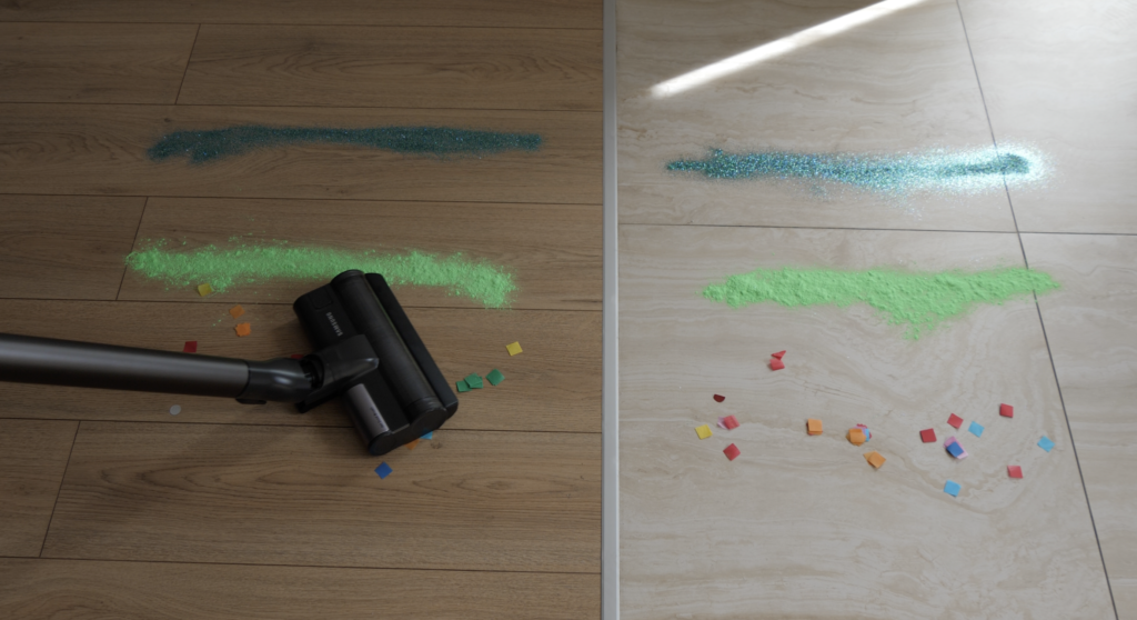 În ceea ce privește aspirarea pe gresie și parchet, aici aspiratorul își face treaba grozav. Pe lângă testul cu pudra colorată și confetiile, am introdus pe podea și ceva sclipici, despre care știm bine că este ceva mai dificil de aspirat. Ei bine, Bespoke Jet s-a descurcat grozav, căci a reușit să îl aspire fără probleme.
