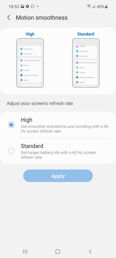 Display-ul Super Amoled de 6,5 inch are o rezoluție de 1080 x 2400 pixeli, oferă suport HDR10, și este protejat cu Gorilla Glass 5. Noutatea este că de această dată Samsung introduce în scenă pe telefoanele mid-range și rata de refresh de 90 Hz. Ca idee, varianta 5G, beneficiază de un refresh rate de 120 Hz. Pentru cei care își doresc un plus de autonomie și nu consideră neapărat importantă o rată de refresh mai bună, pot alege oricând opțiunea standard de 60 Hz. Ecranul este super luminos, măsoară 800 nits, contrastul este bun, culorile vibrante, detalii, nu prea ai ce comenta aici.