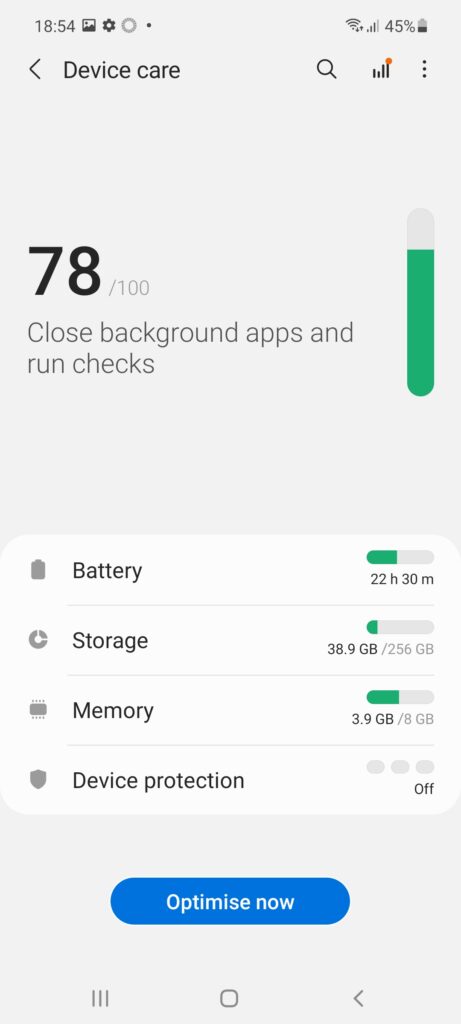 Și la acest capitol vedem o îmbunătățire. Galaxy A52 primește o baterie de 4500 mAh, ce asigură cam 2 zile de autonomie, în condiții de utilizare normală. Din testele noastre s-a încărcat 50% in 44 minute, iar încărcarea completă a durat 1h și 28 minute. Suportă încărcare rapidă la 25W, însă pentru a beneficia de ea va trebui să îți achiziționezi separat un fast charger cu o asemenea putere. Din păcate nici de această dată nu avem wireless charging, ceea ce pentru mine este un mare minus când vine vorba de un telefon.